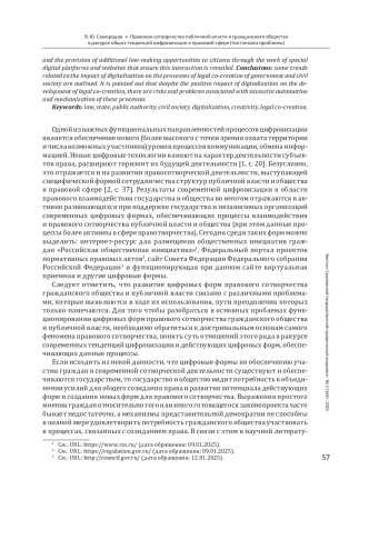 Введение: в современных условиях актуализируются проблемы взаимодействия публичной власти и гражданского общества ввиду интенсивного развития цифровых инструментов правовой коммуникации. Цель - исследовать правовое сотворчество публичной власти и общества в контексте современных цифровых тенденций.