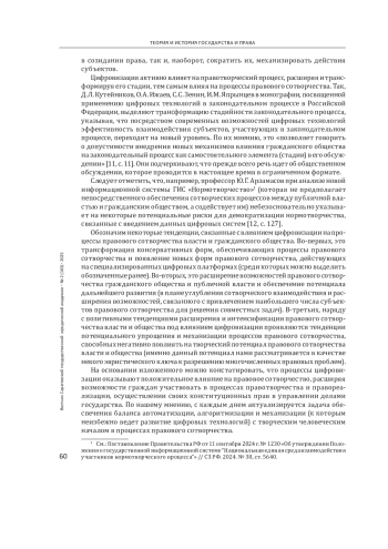 Выводы: обозначены некоторые тенденции, связанные с влиянием цифровизации на процессы правового сотворчества власти и гражданского общества. Указывается, что, несмотря на положительное влияние цифровизации на развитие правового сотворчества, имеются риски и проблемы, связанные с излишней автоматизацией, механизацией данных процессов.