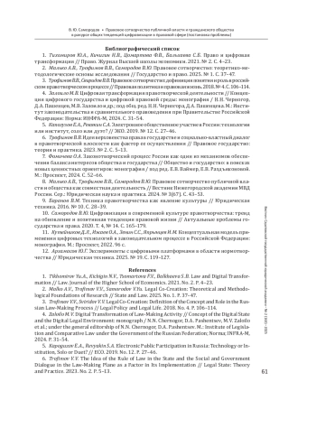 1. Тихомиров Ю.А., Кичигин Н.В., Цомартова Ф.В., Бальхаева С. Б. Право и цифровая трансформация // Право. Журнал Высшей школы экономики. 2021. № 2. С. 4-23. EDN: UHCPTG