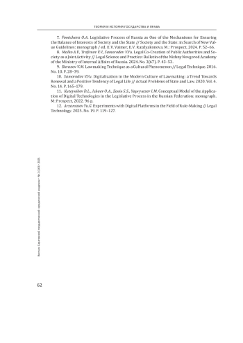 12. Арзамасов Ю. Г. Эксперименты с цифровыми платформами в области нормотворчества // Юридическая техника. 2025. № 19. С. 119-127. EDN: PAHGPN