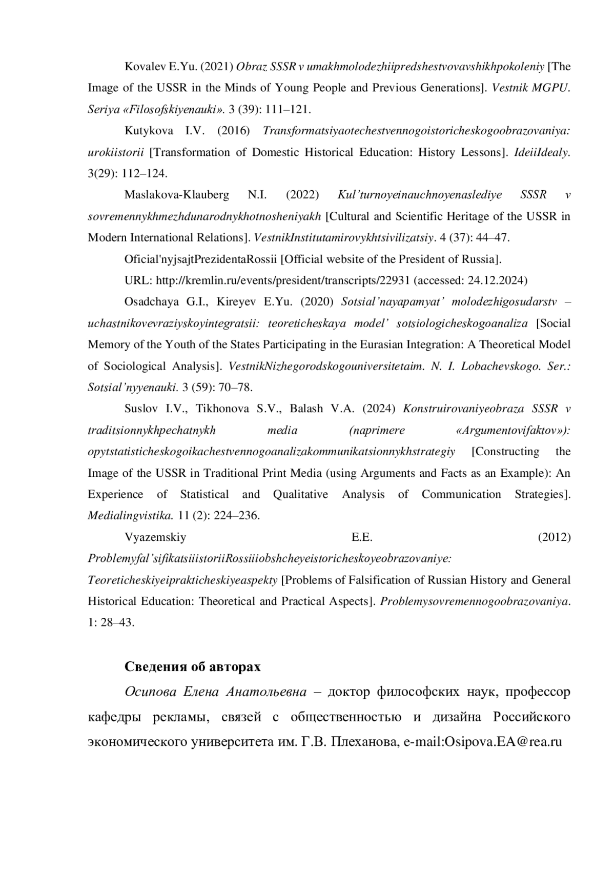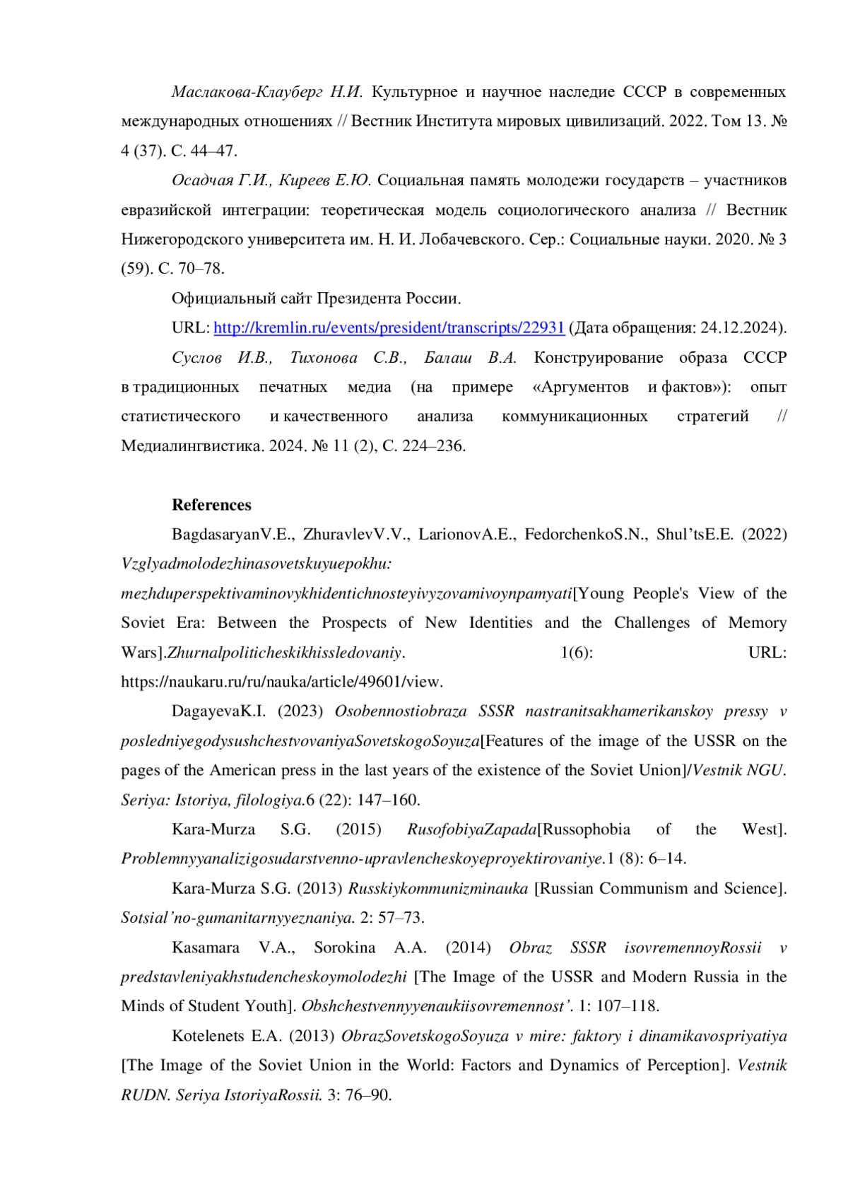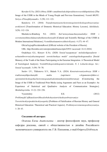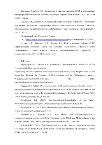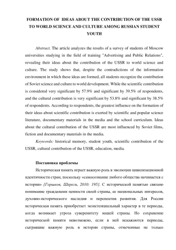 В статье анализируются результаты опросастудентов московских вузов, обучающихся по направлению подготовки «Реклама и связи с общественностью», раскрывающего их представления о вкладе СССР в мировую науку и культуру. Исследование показывает, что, несмотря на противоречивость информационной среды, в которой формируются эти представления, все студенты признают вклад советской науки и культуры в мировое развитие. При этом, научный вклад считают очень значимым 57,9% и значимым — 39,5% респондентов, а культурный вклад очень значимым — 53,8% и значимым — 38,5% респондентов. По мнению респондентов, наибольшее влияние на формирование их представлений о научном вкладе оказывают научная и научно-популярная литература, документальные материалы в СМИ и СМК и школьная программа. На представления о культурном вкладе СССР больше всего влияют советские фильмы, художественная литература и документальные материалы в СМИ и СМК.