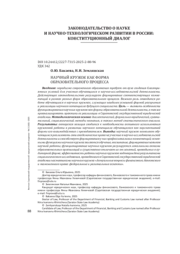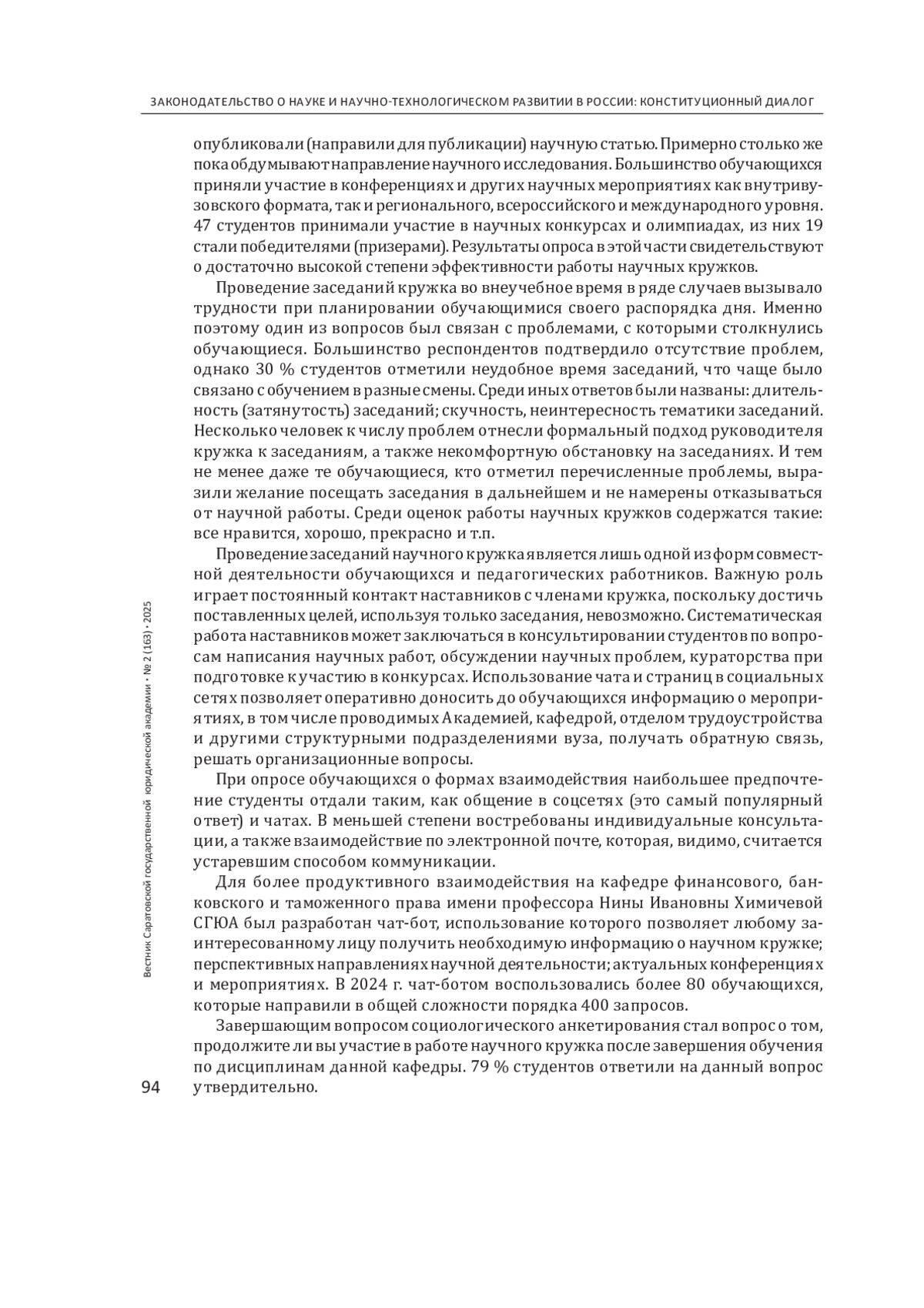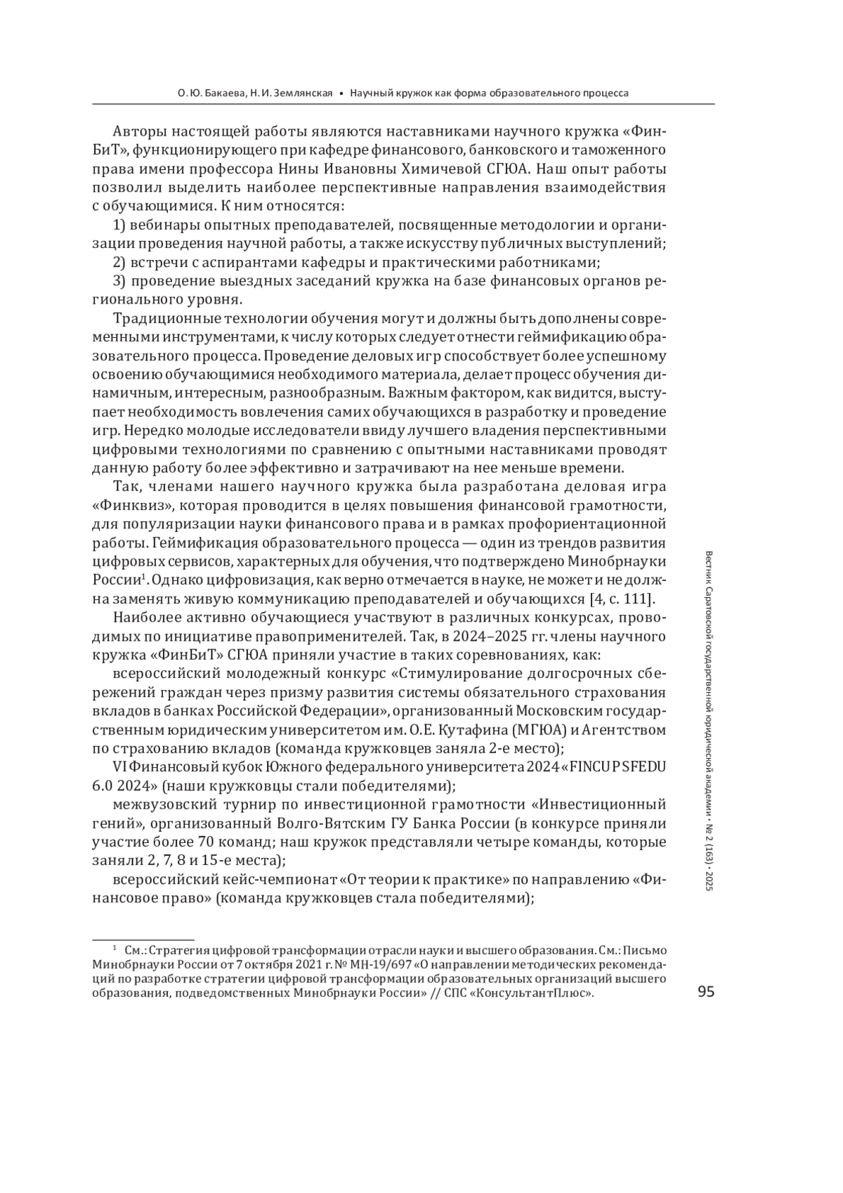 БАКАЕВА О. Ю., ЗЕМЛЯНСКАЯ Н. И. НАУЧНЫЙ КРУЖОК КАК ФОРМА ОБРАЗОВАТЕЛЬНОГО ПРОЦЕССА // ВЕСТНИК САРАТОВСКОЙ ГОСУДАРСТВЕННОЙ ЮРИДИЧЕСКОЙ АКАДЕМИИ. 2025. № 2 (163)