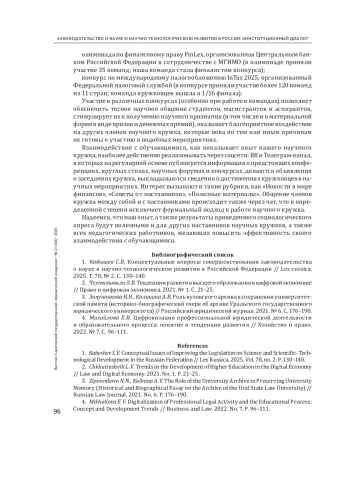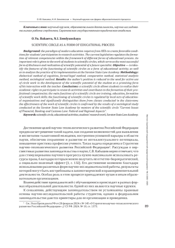 Введение: парадигма современного образования требует от вуза создания благоприятных условий для участия обучающихся в научно-исследовательской деятельности. Действующее законодательство регулирует формирование соответствующих компетенций в рамках разных форм образовательного процесса. Важная роль отводится работе обучающихся в научных кружках, служащих наиболее успешной формой раскрытия и реализации научного потенциала будущего специалиста. Цель - выявить особенности функционирования научных кружков как формы образовательной деятельности, а также проанализировать практики ее реализации в Саратовской государственной юридической академии.