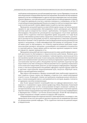 Выводы: научный кружок позволяет обучающимся реализовать свои академические права на участие в научно-исследовательской деятельности и способствует формированию у них профессиональных компетенций; основными функциями научного кружка являются обучение, воспитание, формирование навыков научной работы; функционирование научных кружков регулируется локальными актами образовательных организаций и существенно отличает их от занятий, проводимых в аудиторной форме; эффективность работы научных кружков подтверждена результатами социологического исследования, проведенного в Саратовской государственной юридической академии наставниками научного кружка «Актуальные вопросы финансового, банковского и таможенного права: федеральные и региональные аспекты».