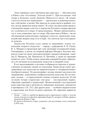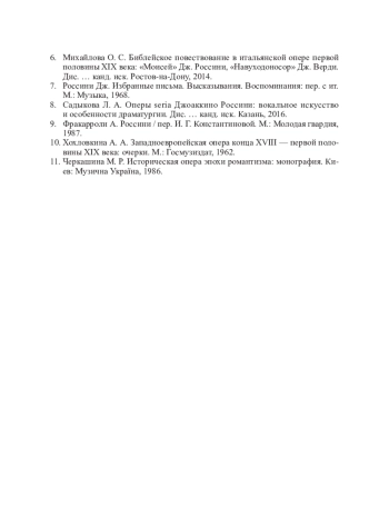 Несмотря на поистине всемирное признание оперного искусства Джоаккино Россини, пришедшее еще при его жизни, в отечественном музыкознании до сих пор нет развернутой монографии, которая полноценно представила бы во всей полноте его 38 опер, многочисленные романсы для голоса и фортепиано, хоровое наследие и камерные концертные сочинения. Единственная русскоязычная монография, написанная Е. Бронфин [1] еще в 50-е годы ХХ века, и популярная монография на итальянском языке А. Фраккароли [9] не претендуют на научно-обоснованное исследование. В течение последних 20 лет появились всего две монографические диссертации, связанные с изучением оперных жанров и отдельных сочинений композитора: О. С. Михайловой в РГК имени Рахманинова [6] и Л. А. Садыковой [8] в Казанской консерватории. В числе прочих работ необходимо выделить книгу А. А. Хохловкиной [10], в которой есть раздел, посвященный интересующим нас сочинениям Россини. В трудах М. Р. Черкашиной рассмотрены произведения исторической тематики [11]. Чтобы выявить эстетические взгляды и воссоздать подлинный образ композитора, были изучены его письма и воспоминания [7].