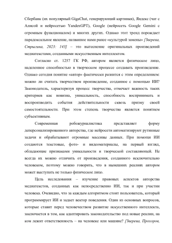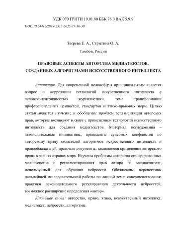 Статья: ПРАВОВЫЕ АСПЕКТЫ АВТОРСТВА МЕДИАТЕКСТОВ, СОЗДАННЫХ АЛГОРИТМАМИ ИСКУССТВЕННОГО ИНТЕЛЛЕКТА (2025)