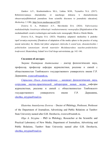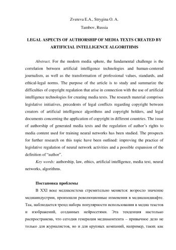 ЗВЕРЕВА Е. А., СТРЫГИНА О. А. ПРАВОВЫЕ АСПЕКТЫ АВТОРСТВА МЕДИАТЕКСТОВ, СОЗДАННЫХ АЛГОРИТМАМИ ИСКУССТВЕННОГО ИНТЕЛЛЕКТА // РОССИЙСКАЯ ШКОЛА СВЯЗЕЙ С ОБЩЕСТВЕННОСТЬЮ. 2025. № 37