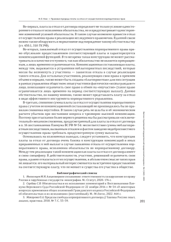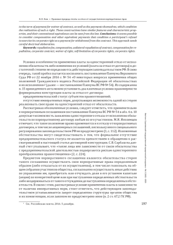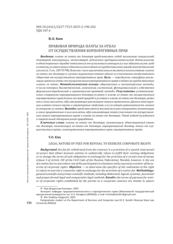 Введение: плата за отказ от договора представляет собой положение специальной договорной конструкции, позволяющей субъектам предпринимательской деятельности в одностороннем порядке отказаться от исполнения имеющихся у них обязательств либо изменить условия таких обязательств в обмен на предоставление определенной денежной суммы (п. 3 ст. 310 ГК РФ). Вместе с тем примечательным является использование платы за отказ от договора в случаях выражения отказа одного из участников хозяйственного общества от осуществления корпоративных прав. Цель - определить специфику реализации права на отказ от осуществления корпоративного права в обмен на предоставление платы за отказ.