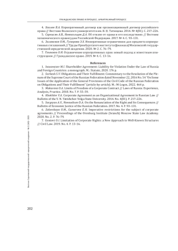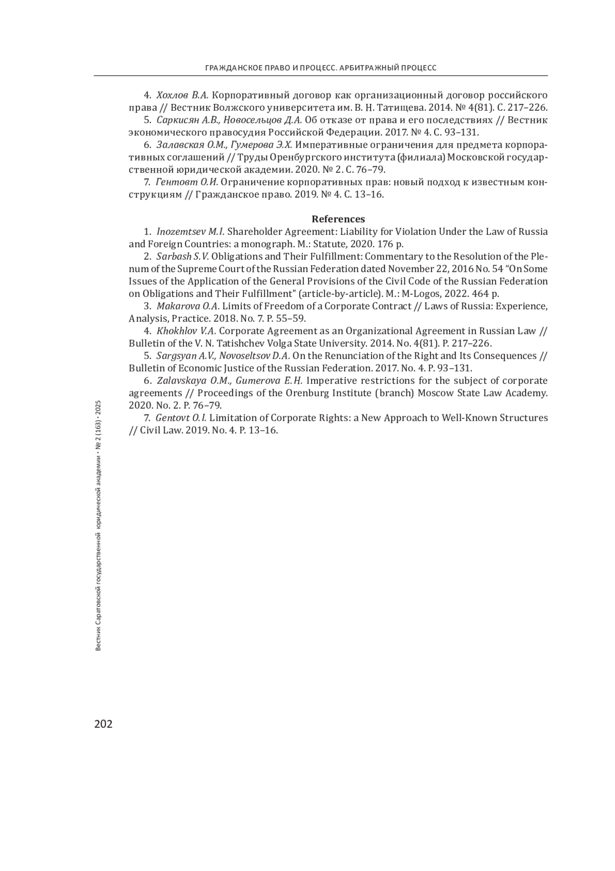 6. Залавская О.М., Гумерова Э. Х. Императивные ограничения для предмета корпоративных соглашений // Труды Оренбургского института (филиала) Московской государственной юридической академии. 2020. № 2. С. 76-79. EDN: EAJZQG