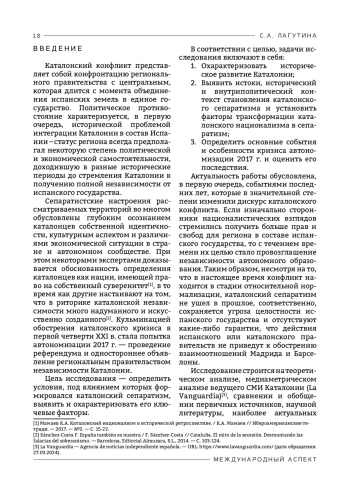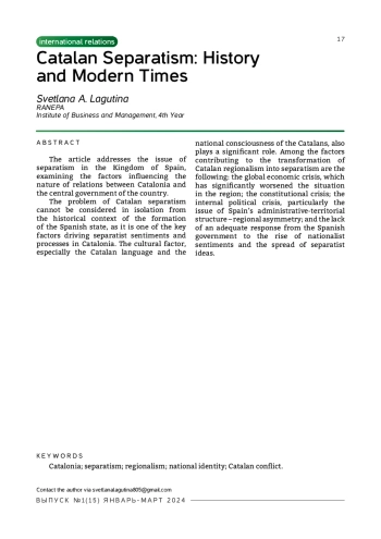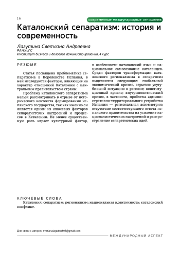 1. Гаврилова С.М. Проблема сепаратизма в современной Испании: каталонский вопрос / С.М. Гаврилова // Проблемы постсоветского пространства. — 2022. — №9(2). — С. 213-229.