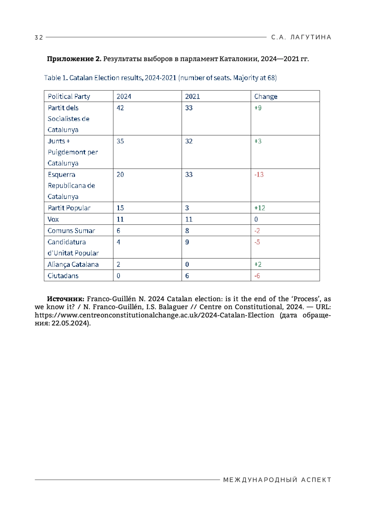 10. Franco-Guillén N. 2024 Catalan election: is it the end of the ‘Process’, as we know it? / N. Franco-Guillén, I.S. Balaguer // Centre on Constitutional Change, 2024. — URL: https://www.centreonconstitutionalchange.ac.uk/2024- Catalan-Election (дата обращения: 22.05.2024).