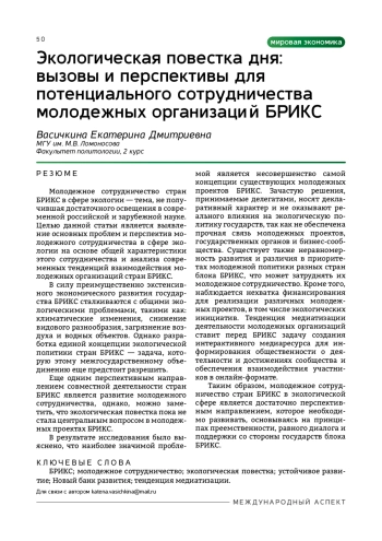 Молодежное сотрудничество стран БРИКС в сфере экологии — тема, не получившая достаточного освещения в современной российской и зарубежной науке. Целью данной статьи является выявление основных проблем и перспектив молодежного сотрудничества в сфере экологии на основе общей характеристики этого сотрудничества и анализа современных тенденций взаимодействия молодежных организаций стран БРИКС.
