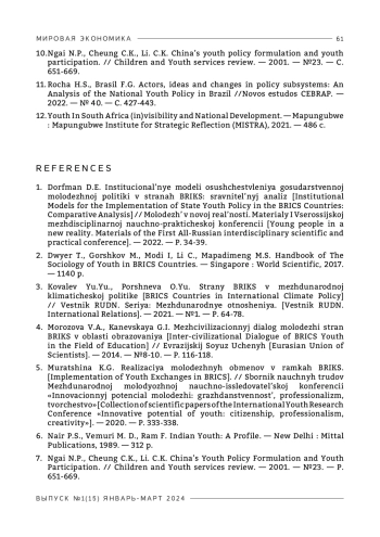 Таким образом, молодежное сотрудничество стран БРИКС в экологической сфере является достаточно перспективным направлением, которое необходимо развивать, основываясь на принципах преемственности, равного диалога и поддержки со стороны государств блока БРИКС.