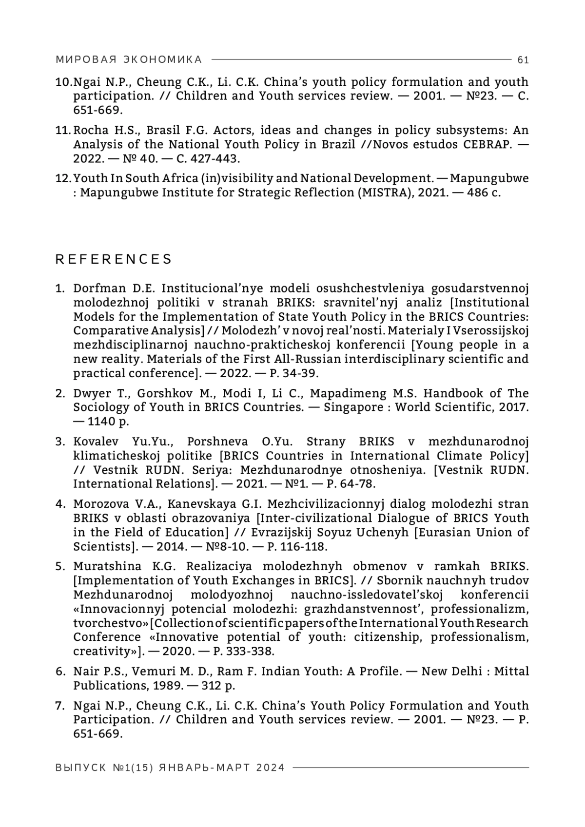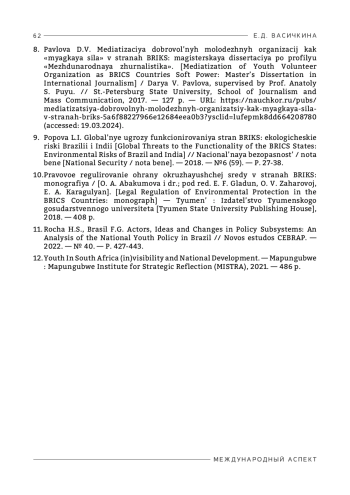Еще одним перспективным направлением совместной деятельности стран БРИКС является развитие молодежного сотрудничества, однако, можно заметить, что экологическая повестка пока не стала центральным вопросом в молодежных проектах БРИКС.