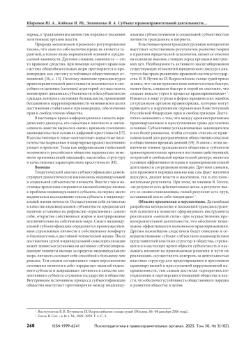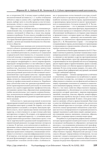 В условиях сетевого общества, основанного на цифровой вовлеченности граждан в активную социальную жизнь посредством сетевых инструментов, необходима разработка новой (трансдискурсивной) методологии юридической психологии и психологии безопасности, позволяющей построить диалоговую форму общения представителей власти и управления с населением, носящую открытый, просоциальный характер, ориентированную на защиту государственных интересов, поддержание устойчивого общественного порядка, защиту прав и свобод граждан. Цель — описание субъекта правоохранительной деятельности и особенностей его континуального взаимодействия с различными группами общества в рамках концепции трансдискурсивной психологии. Материалы, результаты и обсуждение. Анализируется тенденция к постоянному усложнению правовой системы государства, появлению новых угроз общественной безопасности, связанных с активным внедрением во все аспекты жизнедеятельности современного общества цифровых систем, приводящих к появлению и развитию методов информационно-психологической защиты от гибридных угроз, опирающихся на дискурсивные технологии. Рассматривается деятельность властных структур, пытающихся контролировать уровень субъектности общества в целом и отдельных его активных членов, на фоне стихийно растущей потребности общества в субъектности, открытости и прозрачности во взаимодействии с властью. Раскрывается потенциал трансдискурсивной психологии в интересах совершенствования правоохранительной деятельности на основе реализации субъектности сотрудников органов внутренних дел. Выводы. Обосновывается положение о необходимости развития теории и практики трансдискурсивной психологии правоохранительной деятельности, позволяющей отвечать на современные вызовы функционирования правовой системы государства и юридического дискурса.