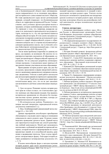 13. Третьякова С.А., Мелешко О.П. Возможности использования новых форм и методов исторического краеведения на уроках истории // StudNet. 2022. № 1. С. 241-247. EDN: UTWKBL