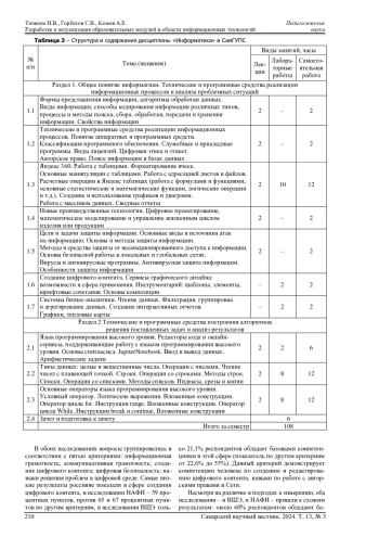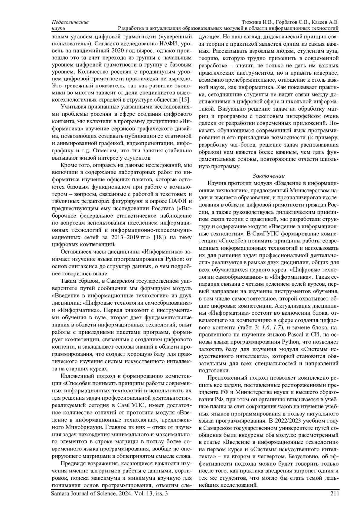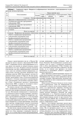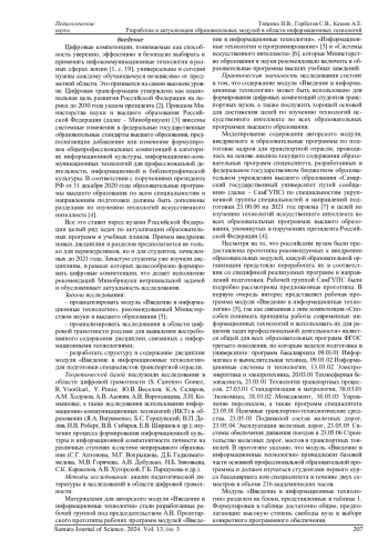В статье анализируются рекомендованные Министерством науки и высшего образования прототипы рабочих программ обучающих модулей «Введение в информационные технологии» и «Информационные технологии и программирование», а также исследования в области цифровой грамотности россиян. Научная новизна состоит в разработке содержания модуля «Введение в информационные технологии», отвечающего целям по внедрению технологий искусственного интеллекта, декларируемых для всех образовательных организаций Российской Федерации. В результате разработана рабочая программа авторского модуля «Введение в информационные технологии», включающая в себя две дисциплины: «Цифровые технологии самообразования» и «Информатика». Деление связано с различием целей указанных дисциплин: первая изучает инструменты обучения, в том числе самостоятельного, вторая охватывает общие цифровые компетенции. Актуализация дисциплины «Информатика» состоит, в первую очередь, во включении блока, отвечающего за компетенцию в сфере создания цифрового контента, и замены блока изучения языков Pascal и СИ на основы языка программирования Python, что позволяет решить еще одну задачу, поставленную Министерством науки и высшего образования РФ, а именно: заложить базу для изучения модуля «Системы искусственного интеллекта», который становится обязательным для всех специальностей и направлений подготовки. Формируемый образовательный модуль предназначен, в первую очередь, для студентов образовательных программ бакалавриата и специалитета, направленных на подготовку кадров для транспорта и отнесенных к укрупненной группе специальностей и направлений подготовки 23.00.00 - Техника и технологии наземного транспорта. Результаты исследования могут быть интересны для методистов и научно-педагогических работников, ведущих активную работу по формированию образовательных модулей в области IT-технологий и искусственного интеллекта.