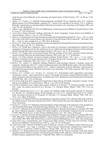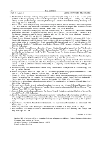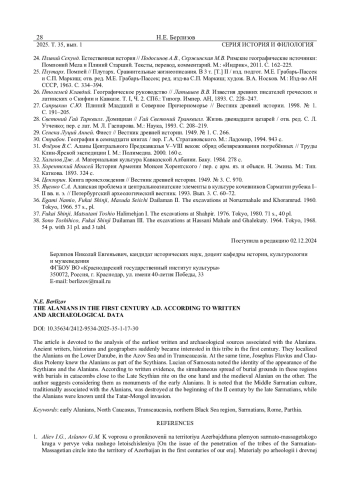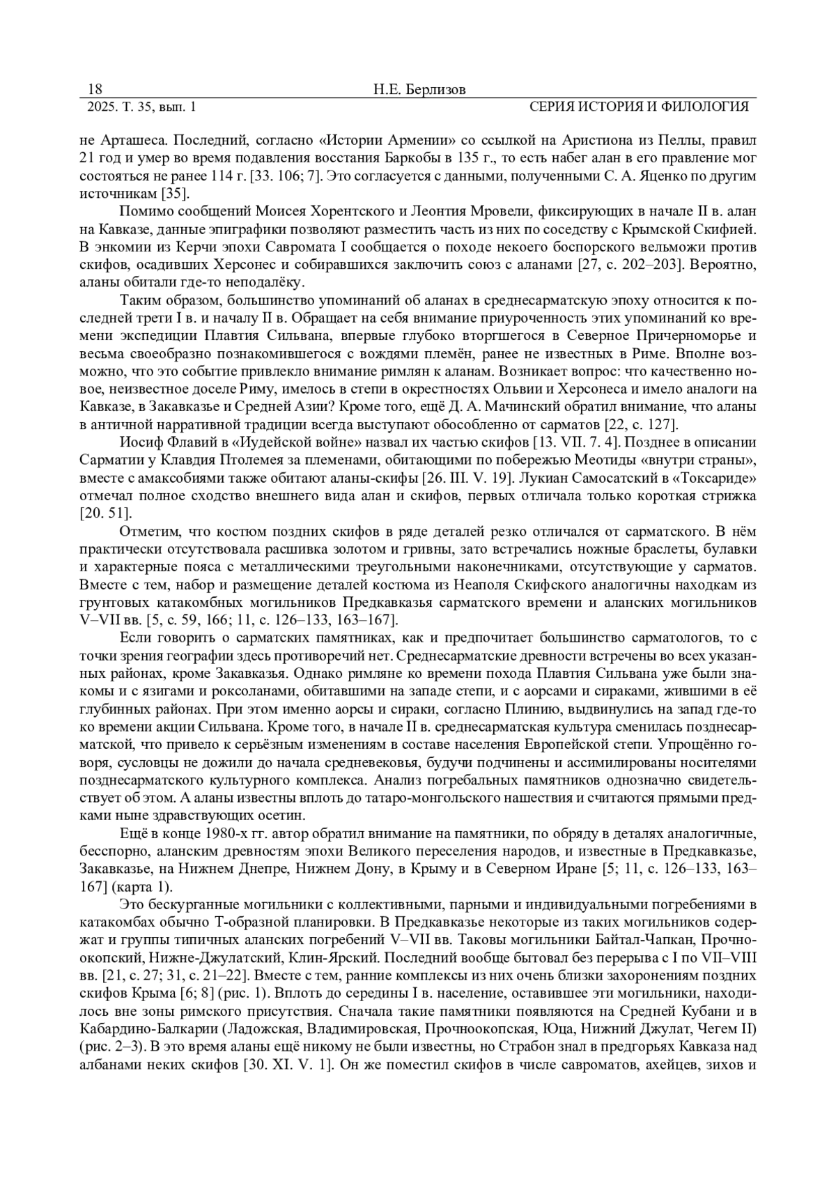 БЕРЛИЗОВ Н. Е. АЛАНЫ В I ВЕКЕ НАШЕЙ ЭРЫ ПО ПИСЬМЕННЫМ И АРХЕОЛОГИЧЕСКИМ ДАННЫМ // ВЕСТНИК УДМУРТСКОГО УНИВЕРСИТЕТА. СЕРИЯ: ИСТОРИЯ И ФИЛОЛОГИЯ. 2025. Т. 35 № 1