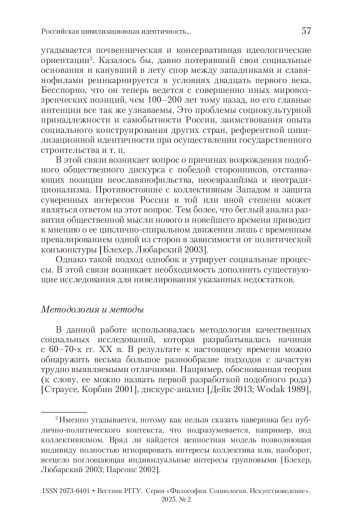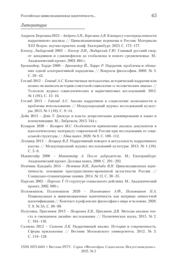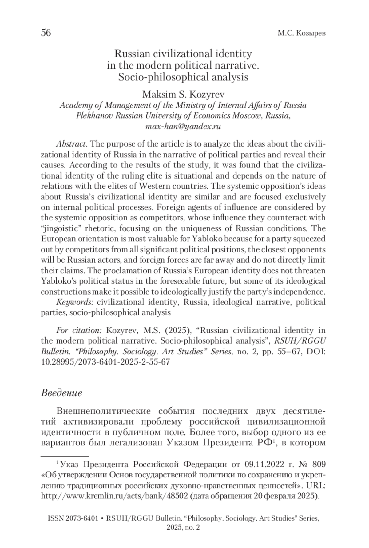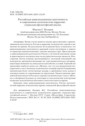 КОЗЫРЕВ М. С. РОССИЙСКАЯ ЦИВИЛИЗАЦИОННАЯ ИДЕНТИЧНОСТЬ В СОВРЕМЕННОМ ПОЛИТИЧЕСКОМ НАРРАТИВЕ: СОЦИАЛЬНО-ФИЛОСОФСКИЙ АНАЛИЗ // ВЕСТНИК РГГУ. СЕРИЯ: ФИЛОСОФИЯ. СОЦИОЛОГИЯ. ИСКУССТВОВЕДЕНИЕ. 2025. № 2