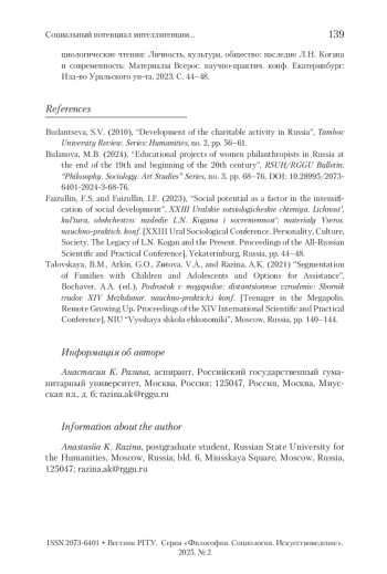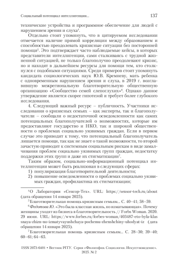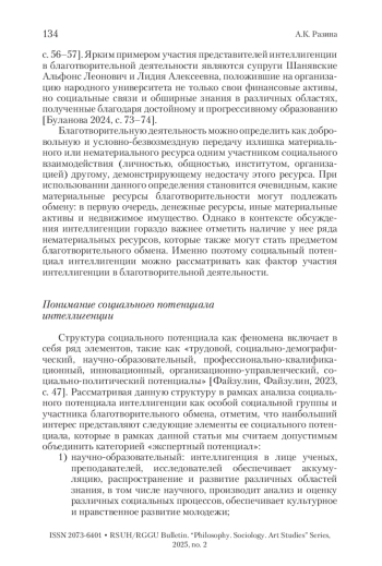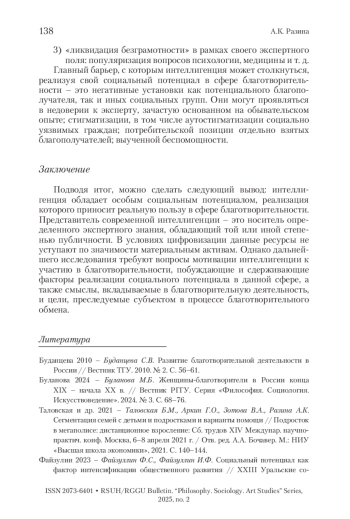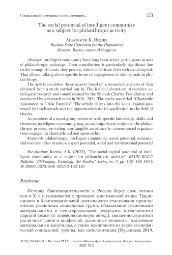 Традиционно представители интеллигенции являлись важными участниками благотворительного обмена. Наличие у данной социальной группы ряда нематериальных ресурсов, составляющих ее богатый социальный потенциал, позволяет говорить об особых формах участия интеллигенции в благотворительной деятельности. В статье на основе вторичного анализа данных исследования «Благотворительная помощь кризисным семьям», проведенного группой исследователей лаборатории «Ксилаб» по заказу Благотворительного фонда «Шалаш» в 2020–2021 гг., рассматриваются специфичные элементы социального потенциала интеллигенции и возможности для их реализации в сфере благотворительности. Интеллигенция как социальная группа носителей специфических знаний, навыков и ресурсов может выступать значимым субъектом благотворительного процесса, оказывая нематериальную помощь как благополучателям, так и различным социальным организациям в сфере благотворительной помощи и меценатства.