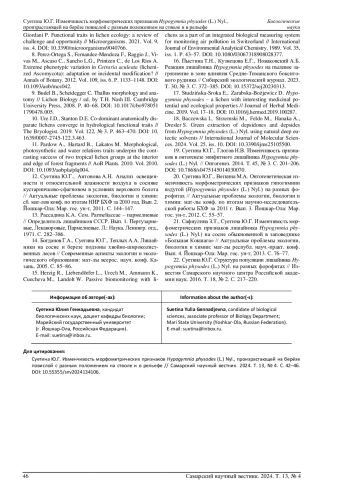 16. Пыстина Т.Н., Кузнецова Е.Г., Новаковский А.Б. Реакция лишайника Hypogymnia physodes на пылевое загрязнение в зоне влияния Средне-Тиманского бокситового рудника // Сибирский экологический журнал. 2023. Т. 30, № 3. С. 372-385. DOI: 10.15372/sej20230313 EDN: GSUAIP