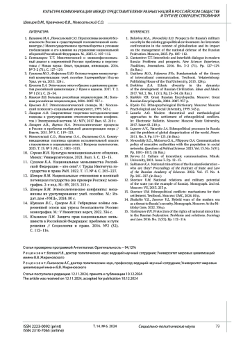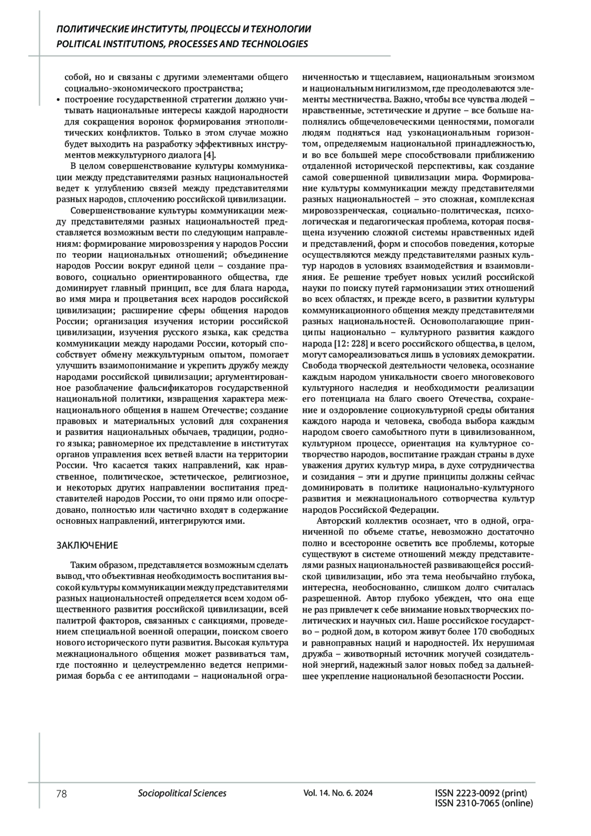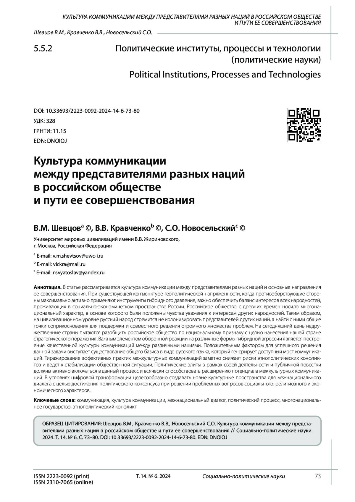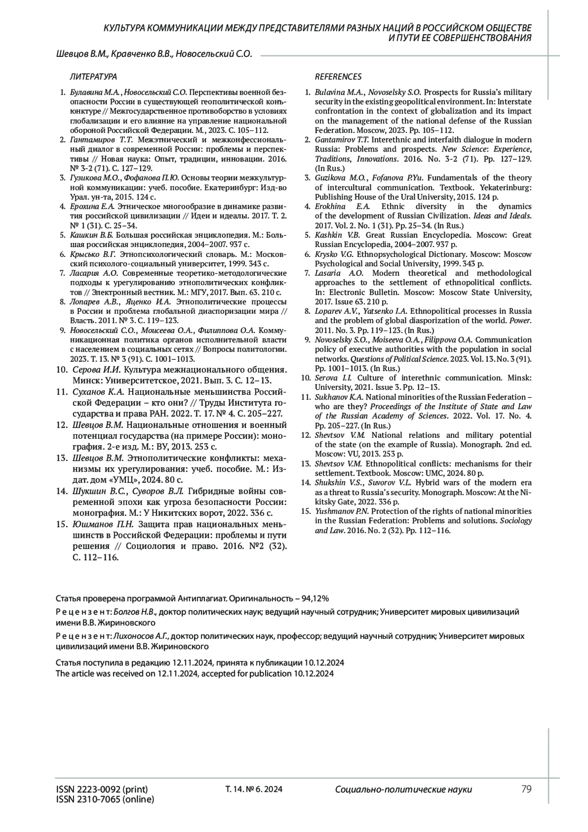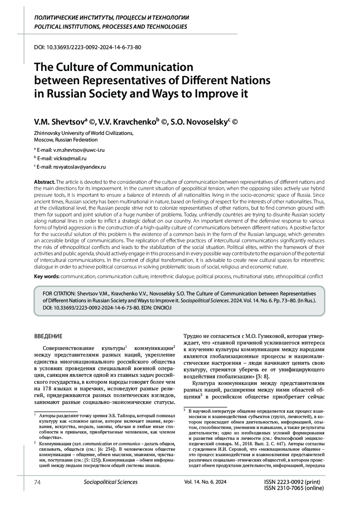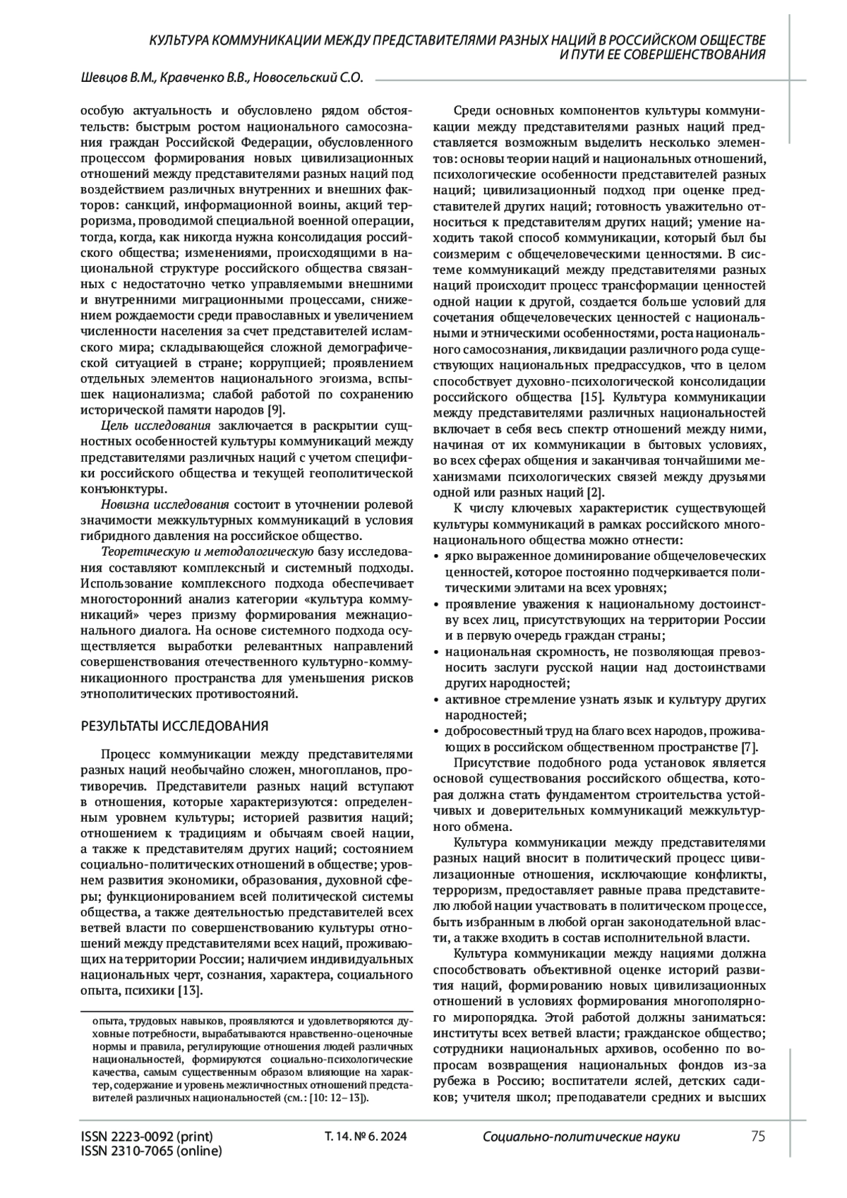ШЕВЦОВ В. М., КРАВЧЕНКО В. В., НОВОСЕЛЬСКИЙ С. О. КУЛЬТУРА КОММУНИКАЦИИ МЕЖДУ ПРЕДСТАВИТЕЛЯМИ РАЗНЫХ НАЦИЙ В РОССИЙСКОМ ОБЩЕСТВЕ И ПУТИ ЕЕ СОВЕРШЕНСТВОВАНИЯ // СОЦИАЛЬНО-ПОЛИТИЧЕСКИЕ НАУКИ. 2024. Т. 14 № 6