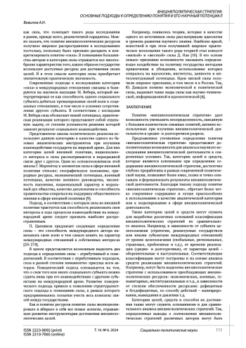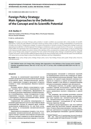 Анализ и изучение внешнеполитической деятельности в современных условиях связаны с широким плюрализмом научных подходов, в рамках которых основное внимание сосредоточено на факторах различного характера, а также многообразием трактовок распространенных ключевых понятий, одним из которых является «внешнеполитическая стратегия». Анализ практики использования понятия «внешнеполитическая стратегия» позволяет выявить два подхода к его определению. В рамках первого подхода стратегия рассматривается как план или концепция действий, в рамках второго - как целенаправленная деятельность. В рамках второго подхода, который представляется более продуктивным и перспективным, а также соответствующим отечественной научной традиции, предложен авторский вариант определения данного понятия и его соотношения с такими дефинициями как «внешнеполитический курс», «внешнеполитическая программа». Основное содержание внешнеполитической стратегии раскрывается посредством категорий «цели» и средства», что предоставляет дополнительные возможности для исследования внешнеполитической деятельности, описания и классификации ее разнообразных форм, а также способствует снижению многообразия дефиниций и их трактовок.