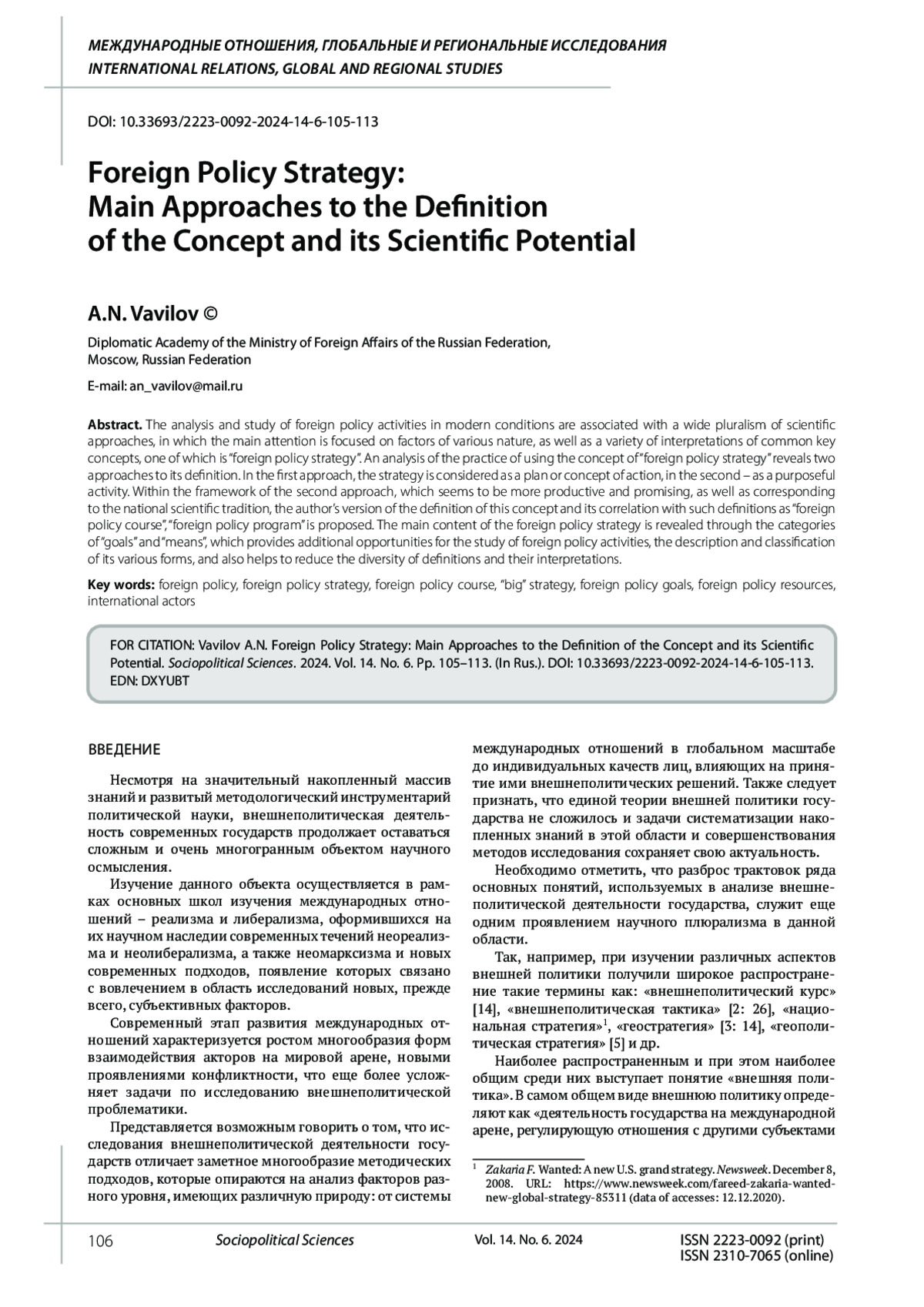 6. Косоруков А.А. Внешнеполитическая стратегия современного государства: соотношение глобального и национального: монография. М.: МАКС Пресс, 2016. EDN: VVLFUV