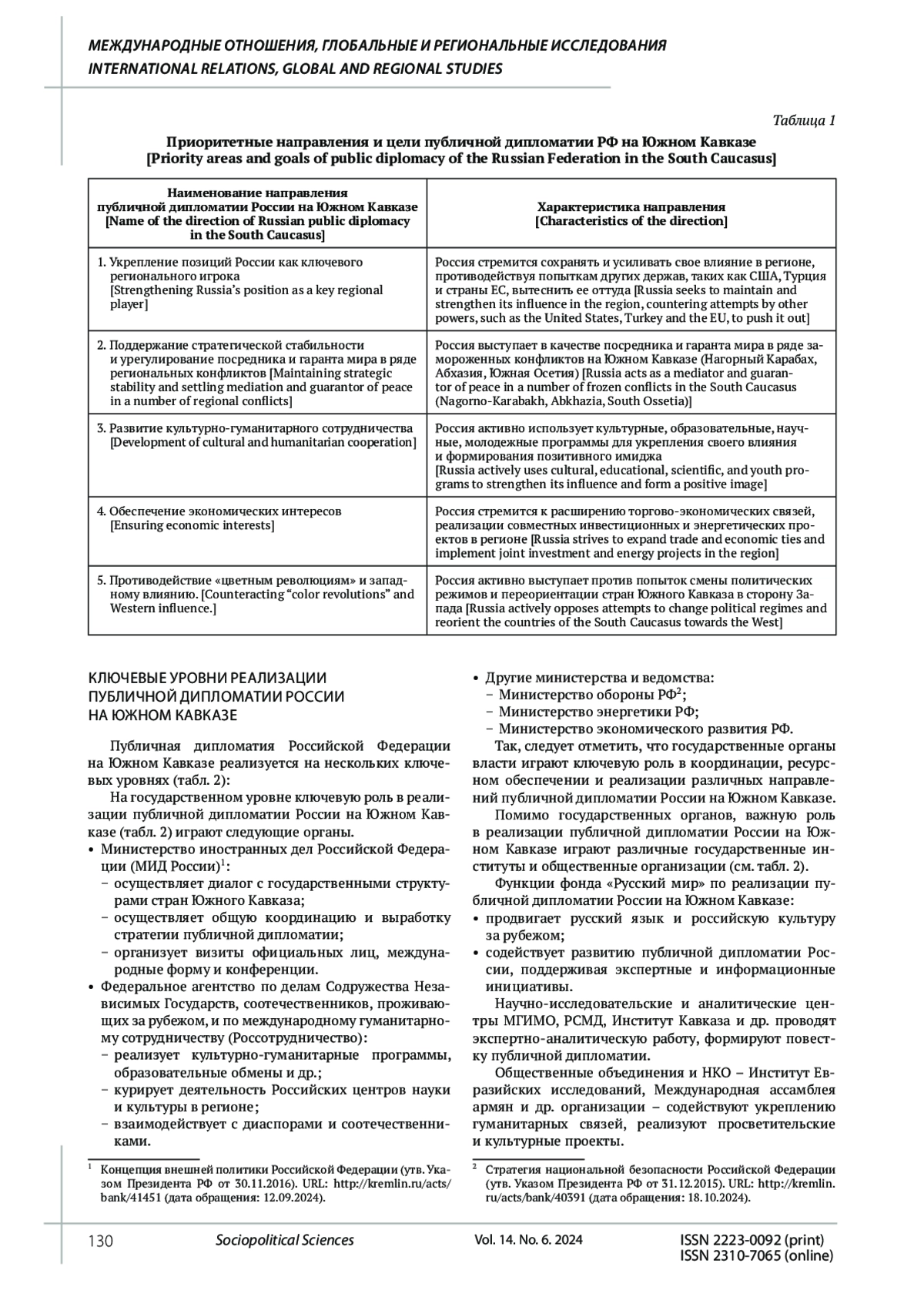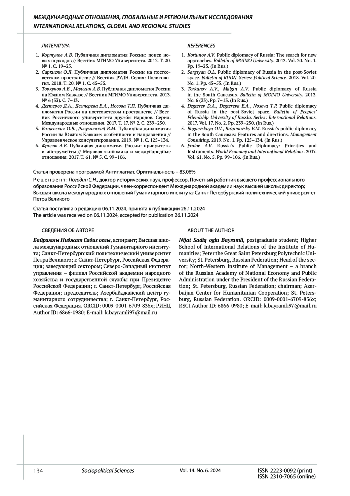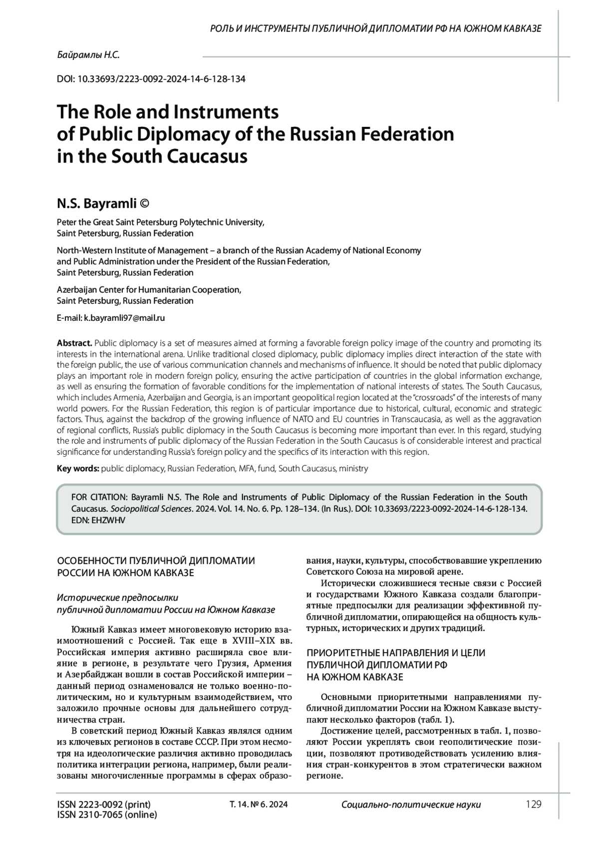 Публичная дипломатия представляет собой комплекс мер, направленных на формирование благоприятного внешнеполитического имиджа страны и продвижение ее интересов на международной арене. В отличие от традиционной закрытый дипломатии, публичная дипломатия подразумевает непосредственное взаимодействие государства с зарубежной общественностью, использование различных коммуникативных каналов и механизмов влияния. Следует отметить, что публичная дипломатия играет важную роль в современной внешней политике, обеспечивая активное участие стран в глобальном информационном обмене, а также обеспечивая формирование благоприятных условий для реализации национальных интересов государств. Южный Кавказ, включающий в себя Армению, Азербайджан и Грузию, выступает важным геополитическим регионом, находящимся на «перекрестке» интересов многих мировых держав. Для Российской Федерации этот регион имеет особо важное значение, которое обусловлено историческими, культурными, экономическими и стратегическими факторами. Так, на фоне усиления влияния стран НАТО и ЕС в Закавказье, а также обострения региональных конфликтов, публичная дипломатия России на Южном Кавказе приобретает как никогда высокую степень важности. В связи с этим, изучение роли и инструментов публичной дипломатии Российской Федерации на Южном Кавказе представляет значительный интерес и практическую значимость для понимания внешнеполитического курса России и особенностей ее взаимодействия с этим регионом.