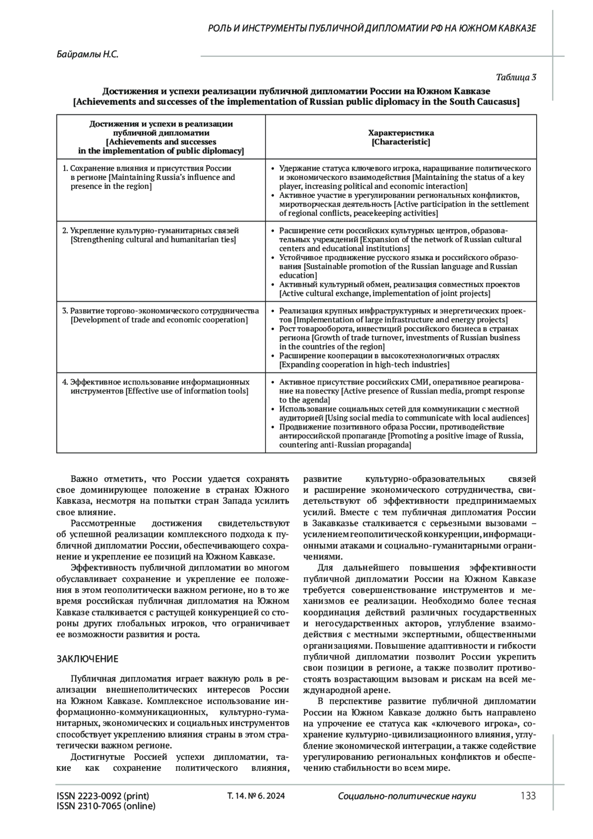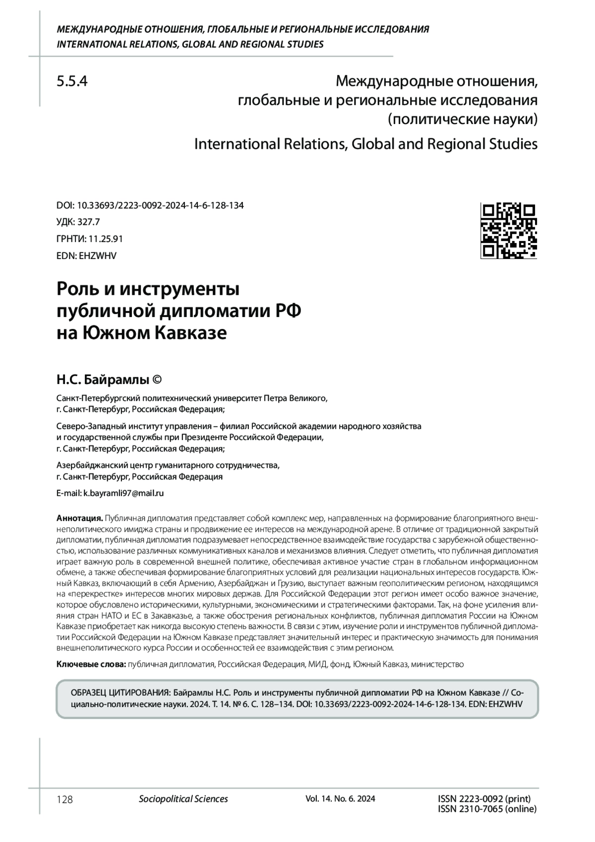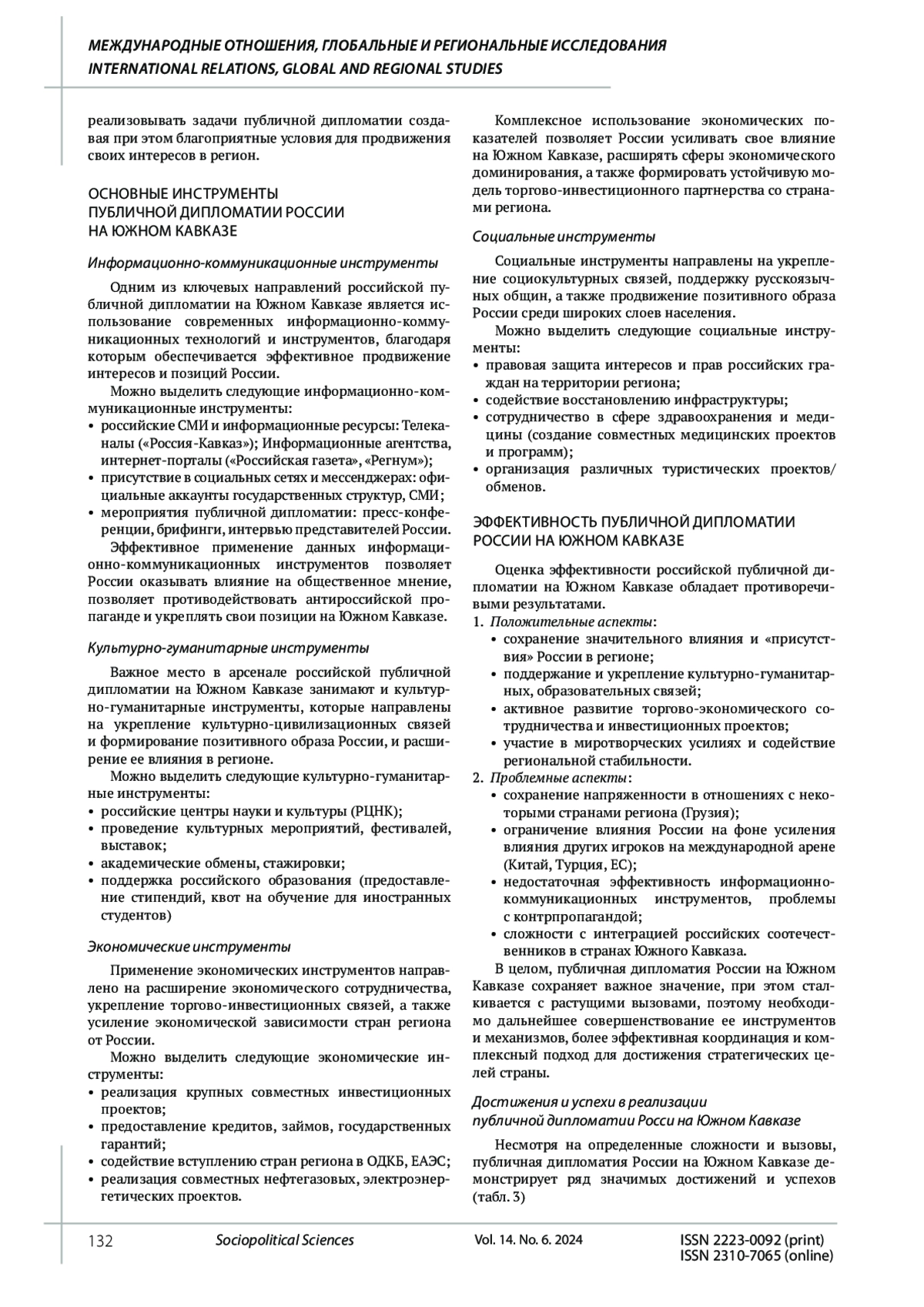 Публичная дипломатия представляет собой комплекс мер, направленных на формирование благоприятного внешнеполитического имиджа страны и продвижение ее интересов на международной арене. В отличие от традиционной закрытый дипломатии, публичная дипломатия подразумевает непосредственное взаимодействие государства с зарубежной общественностью, использование различных коммуникативных каналов и механизмов влияния. Следует отметить, что публичная дипломатия играет важную роль в современной внешней политике, обеспечивая активное участие стран в глобальном информационном обмене, а также обеспечивая формирование благоприятных условий для реализации национальных интересов государств. Южный Кавказ, включающий в себя Армению, Азербайджан и Грузию, выступает важным геополитическим регионом, находящимся на «перекрестке» интересов многих мировых держав. Для Российской Федерации этот регион имеет особо важное значение, которое обусловлено историческими, культурными, экономическими и стратегическими факторами. Так, на фоне усиления влияния стран НАТО и ЕС в Закавказье, а также обострения региональных конфликтов, публичная дипломатия России на Южном Кавказе приобретает как никогда высокую степень важности. В связи с этим, изучение роли и инструментов публичной дипломатии Российской Федерации на Южном Кавказе представляет значительный интерес и практическую значимость для понимания внешнеполитического курса России и особенностей ее взаимодействия с этим регионом.