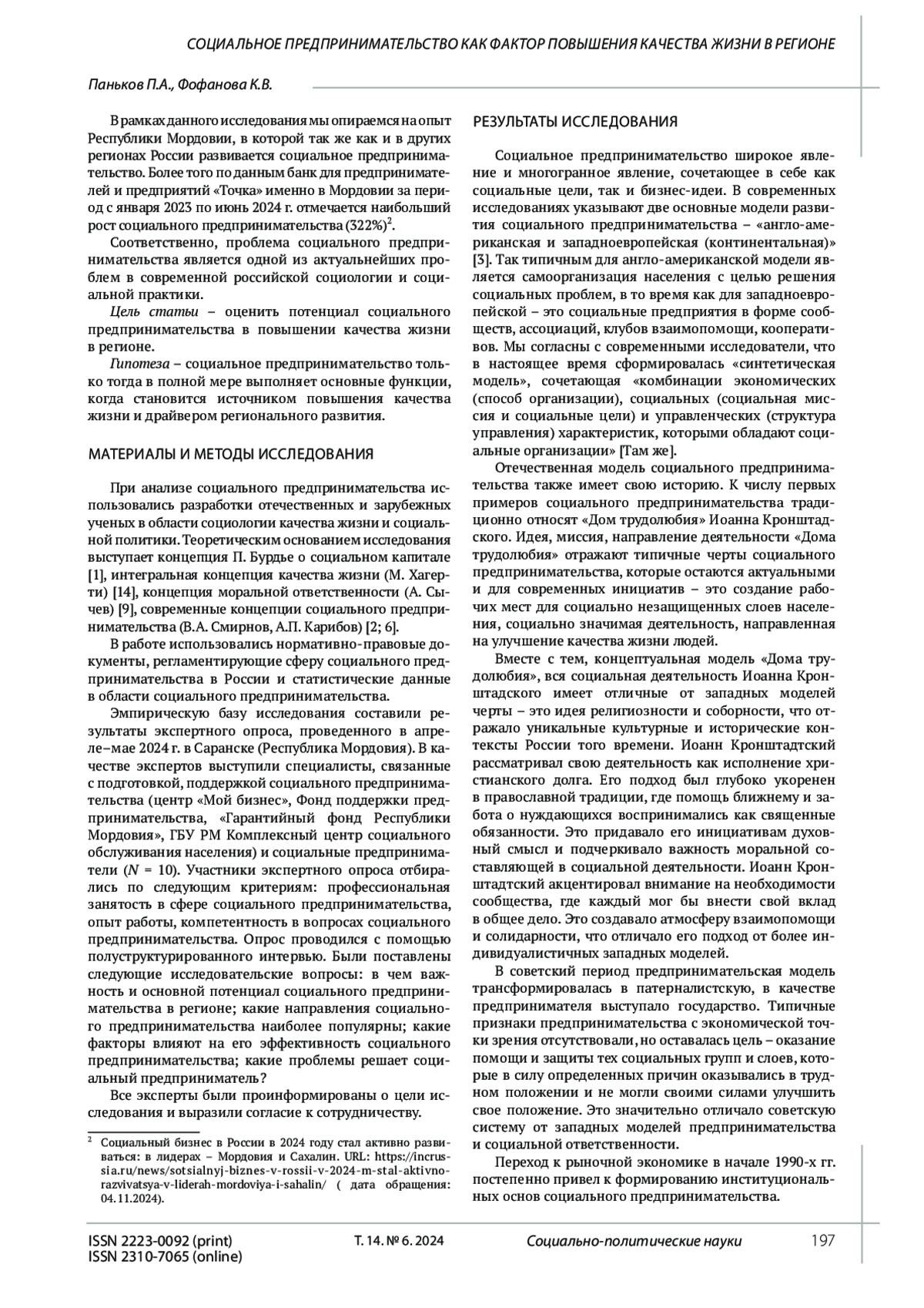 В статье рассматриваются проблемы становления и развития социального предпринимательства. Анализируются основные модели «социального предпринимательства», верифицируются признаки и критерии данного явления. Цель исследования заключается в определении потенциала социального предпринимательства для улучшения качества жизни в регионе, на примере Республики Мордовия. Исследование основывается на теоретических подходах, рассматривающих социальное предпринимательство через концепции социального капитала, социальной и моральной ответственности, качества жизни. Направления и критерии социального предпринимательства рассмотрены на основе нормативно-правовой базы, представлены данные экспертного опроса. Выводы. В результате проведенного исследования авторы приходят к выводу, что социальное предпринимательство в настоящее время становится активным субъектом социальной политики, реализуемой на уровне региона. Авторы предлагают рассматривать социальное предпринимательство как гибридное явление, которое сочетает в себе экономические стратегии и социальную активность. В Республике Мордовия социальное предпринимательство выступает как инструмент для решения местных социально-экономических проблем. В регионе наблюдается увеличение инициатив, направленных на поддержку уязвимых слоев населения, создание рабочих мест и развитие местных сообществ. Социальные предприниматели становятся катализаторами изменений, формируя новое сознание, в котором каждый человек имеет возможность внести свой вклад в общее благо. Эмпирические данные показывают, что социальное предпринимательство способствует развитию социального капитала через укрепление социальных связей, создание доверия, поддержание репутации и внедрение социальных инноваций.