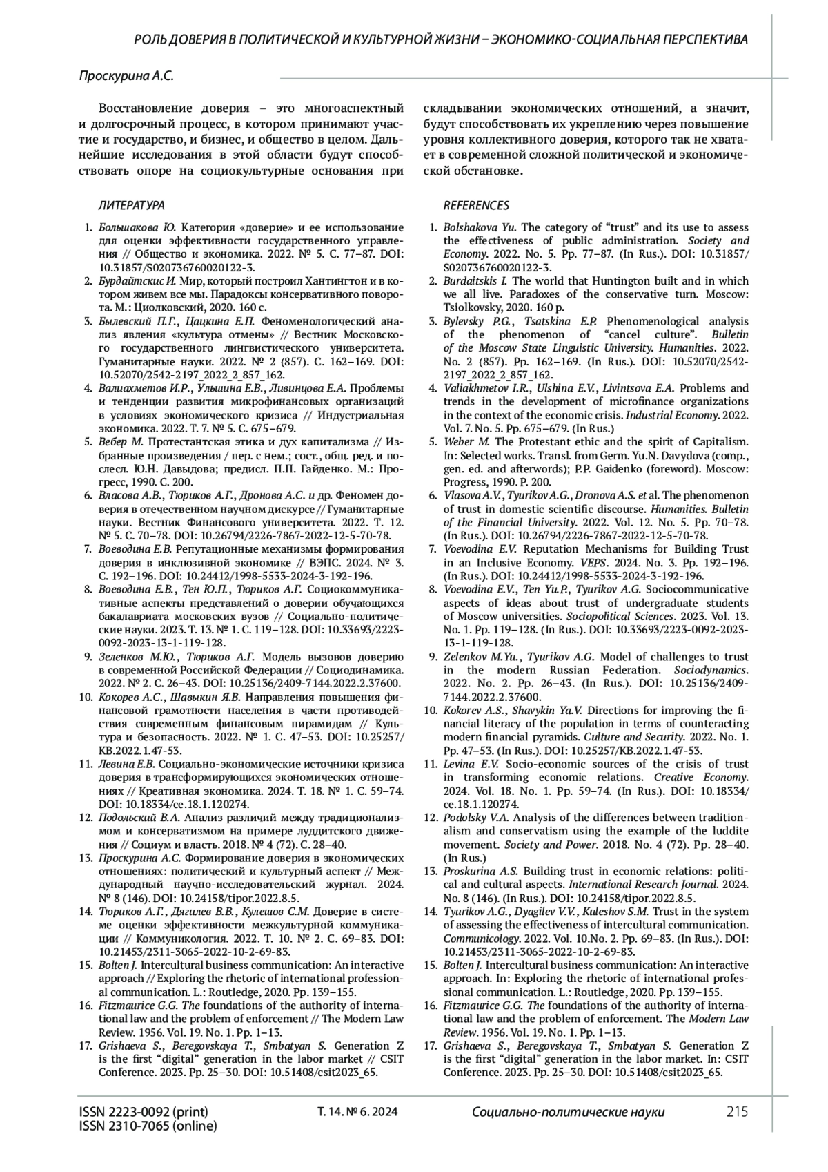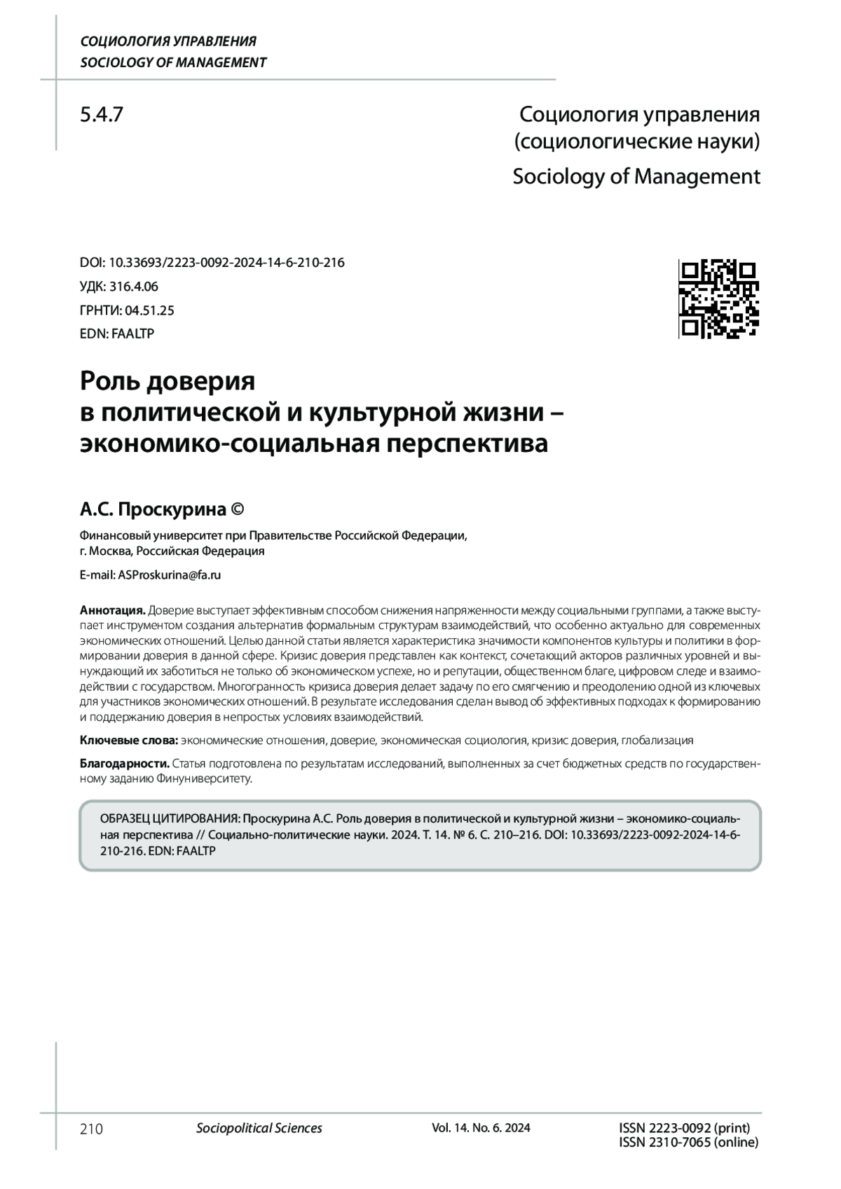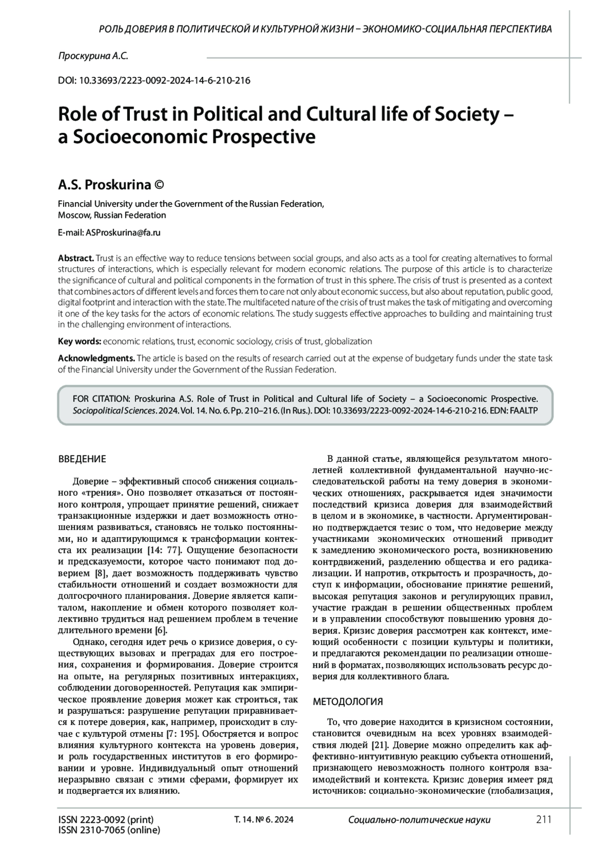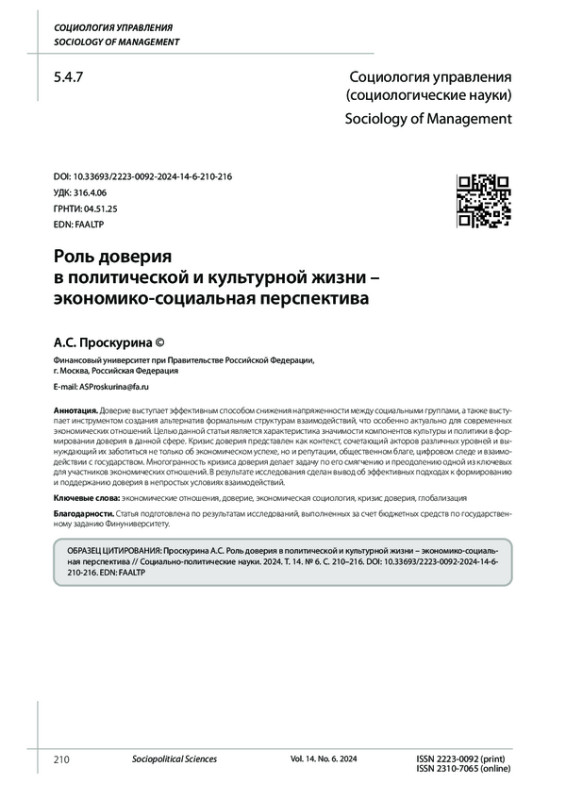 ПРОСКУРИНА А. С. РОЛЬ ДОВЕРИЯ В ПОЛИТИЧЕСКОЙ И КУЛЬТУРНОЙ ЖИЗНИ - ЭКОНОМИКО-СОЦИАЛЬНАЯ ПЕРСПЕКТИВА // СОЦИАЛЬНО-ПОЛИТИЧЕСКИЕ НАУКИ. 2024. Т. 14 № 6