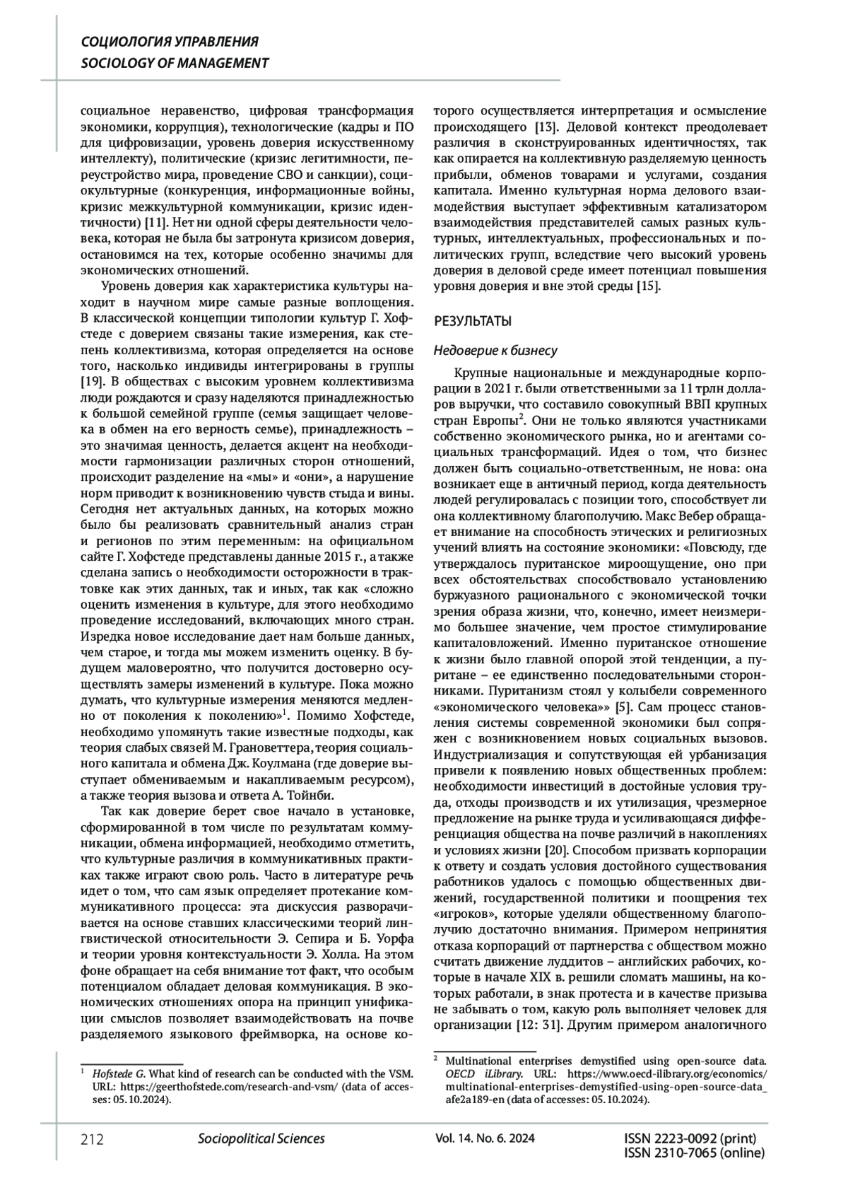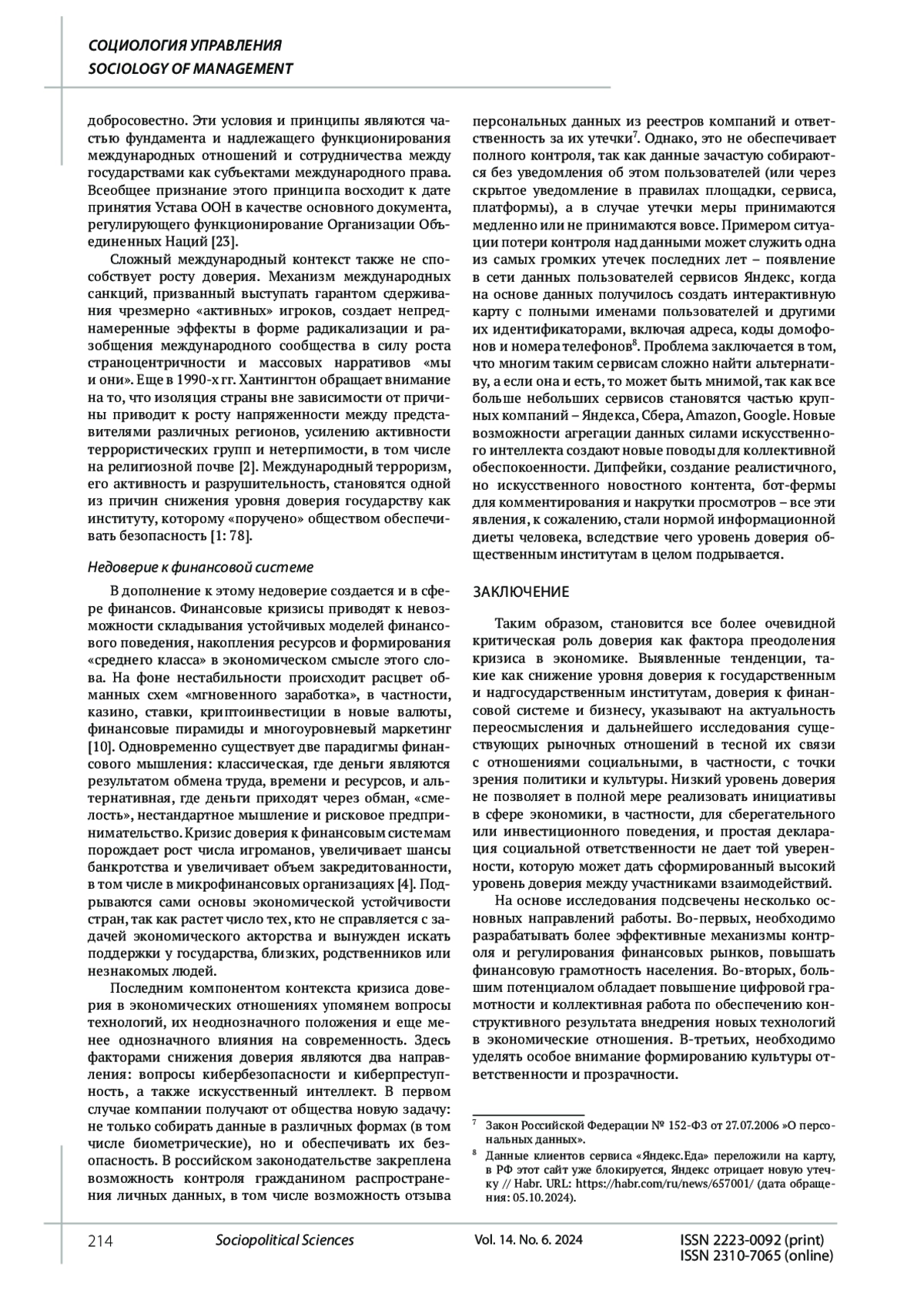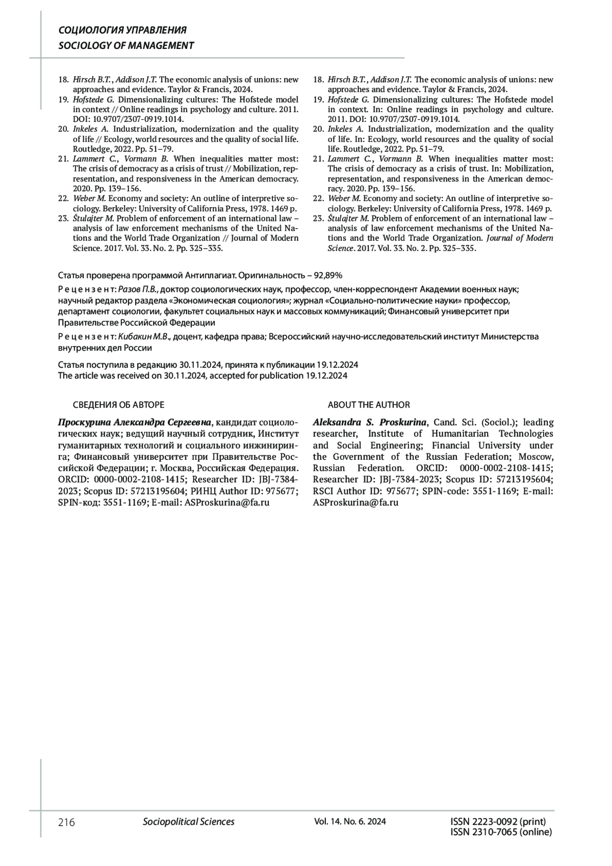 ПРОСКУРИНА А. С. РОЛЬ ДОВЕРИЯ В ПОЛИТИЧЕСКОЙ И КУЛЬТУРНОЙ ЖИЗНИ - ЭКОНОМИКО-СОЦИАЛЬНАЯ ПЕРСПЕКТИВА // СОЦИАЛЬНО-ПОЛИТИЧЕСКИЕ НАУКИ. 2024. Т. 14 № 6