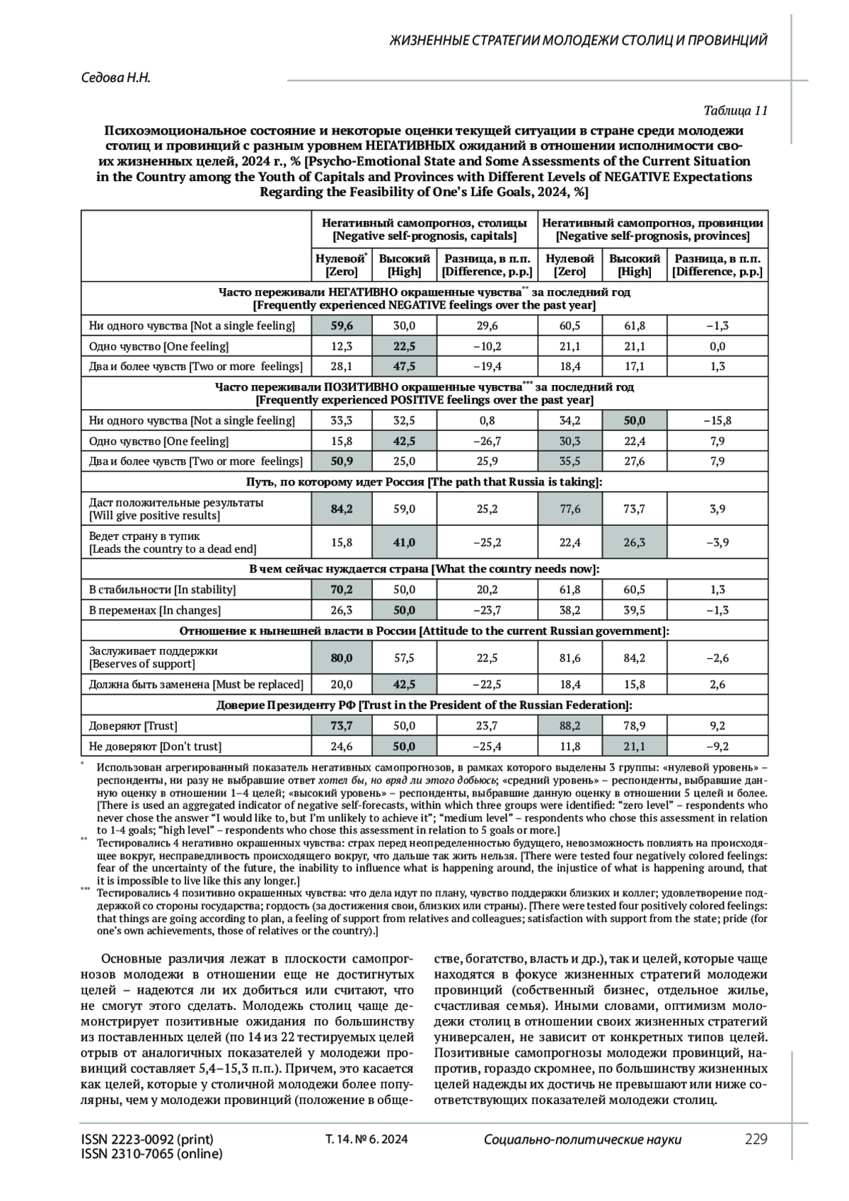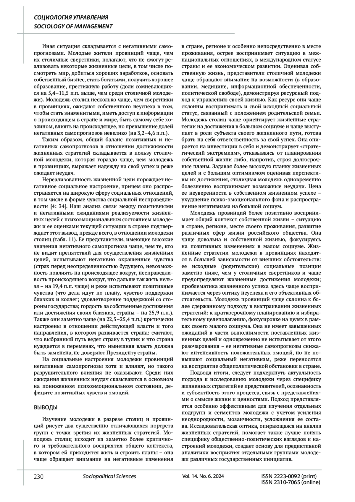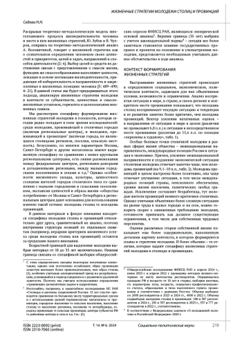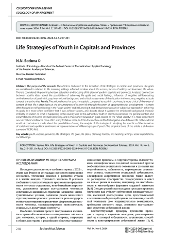 Цель исследования. Статья посвящена вопросу формирования жизненных стратегий молодежи столиц и провинций. Жизненные цели рассматриваются во взаимосвязи со смысложизненными установками, отраженными в представлениях о жизненном успехе, факторах их достижения, жизненных ценностях. Рассмотрен горизонт жизненного планирования, насыщенность и фокусировка жизненных планов молодежи столиц и провинций. Анализируется связь между представлениями молодежи о возможности достижения жизненных целей, с одной стороны, и социальными настроениями - с другой; влияние негативных самопрогнозов на формирование пессимистического эмоционального фона и критических оценок состояния дел в стране, негативного отношения к власти. Выводы. В статье показано, что молодежь столиц, по сравнению с молодежью провинций, более критична к внешнему контексту своей жизнедеятельности; на обстоятельства собственной жизни чаще смотрит через призму возможностей для развития. Она чаще ориентирована на самопозиционирование в «большом социуме» и влияние на него, в достижении целей демонстрирует активный субъектный подход. Она чаще уверена, что сможет добиться успеха, а сомнения в нем ухудшают эмоциональный фон, повышают критичность в отношении к происходящему в стране и к власти. Молодежь провинций более позитивно воспринимает общий контекст и обстоятельства собственной жизни, чаще ориентирована на цели, связанные с «малым социумом». Она более зависима от внешних обстоятельств, чаще готова к жизненному неуспеху, но это не вызывает у нее негатива по отношению к собственной жизни или к внешнему миру. Делается вывод о возможностях использования анализа жизненных стратегий в изучении специфики формирования социальных и общественно-политических настроений представителей разных групп молодежи. Эмпирическая база статьи - общероссийские опросы ФНИСЦ РАН.