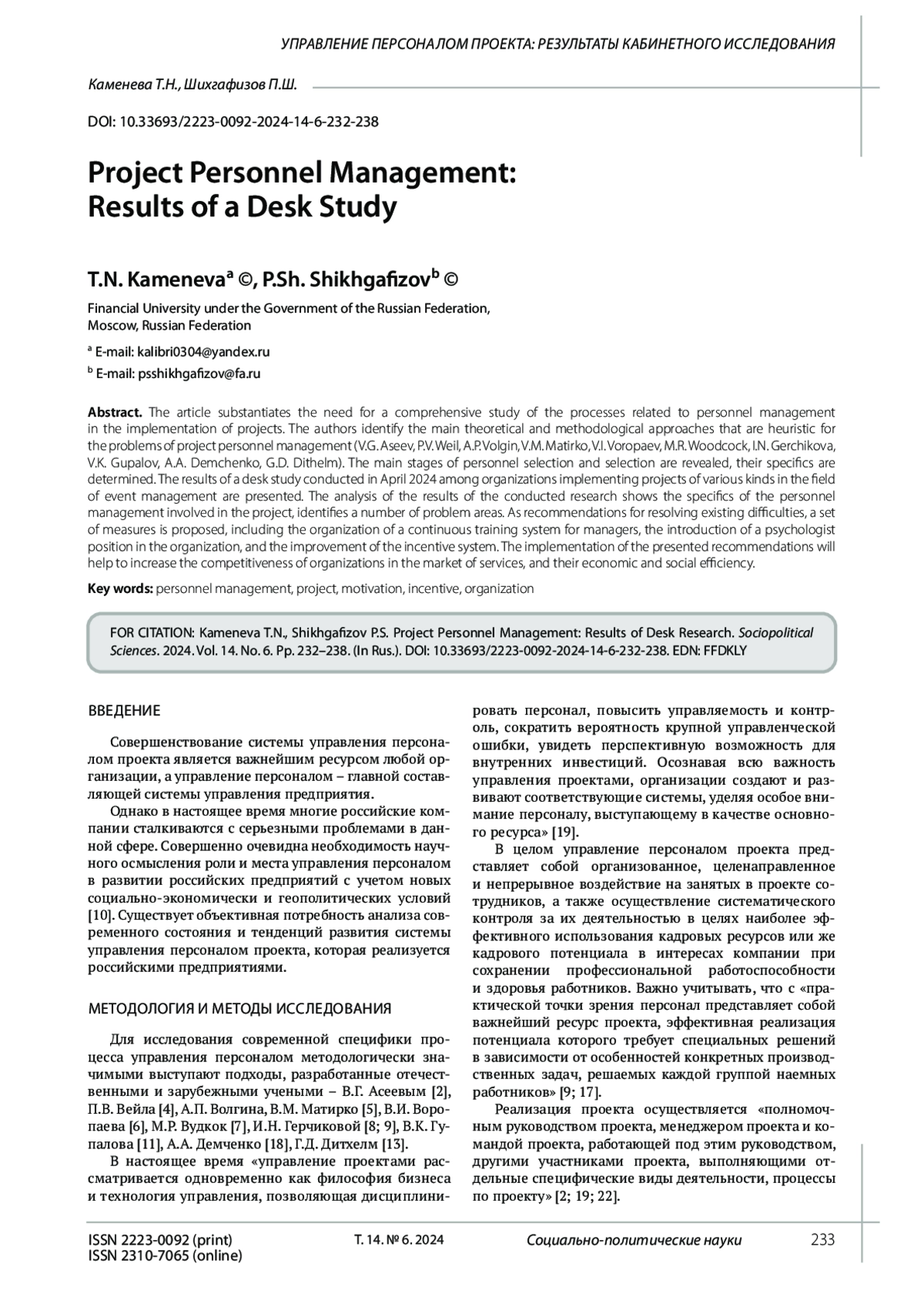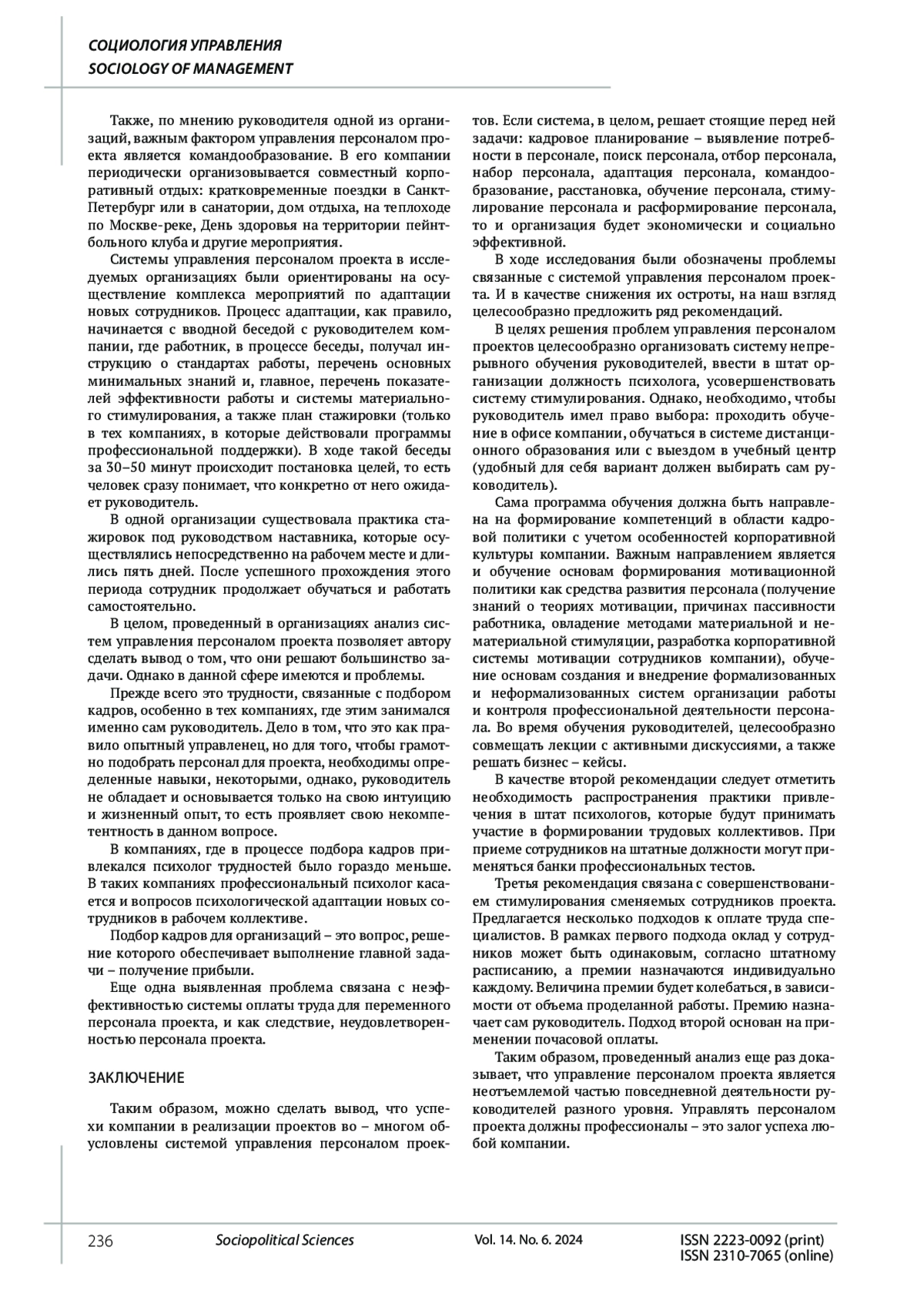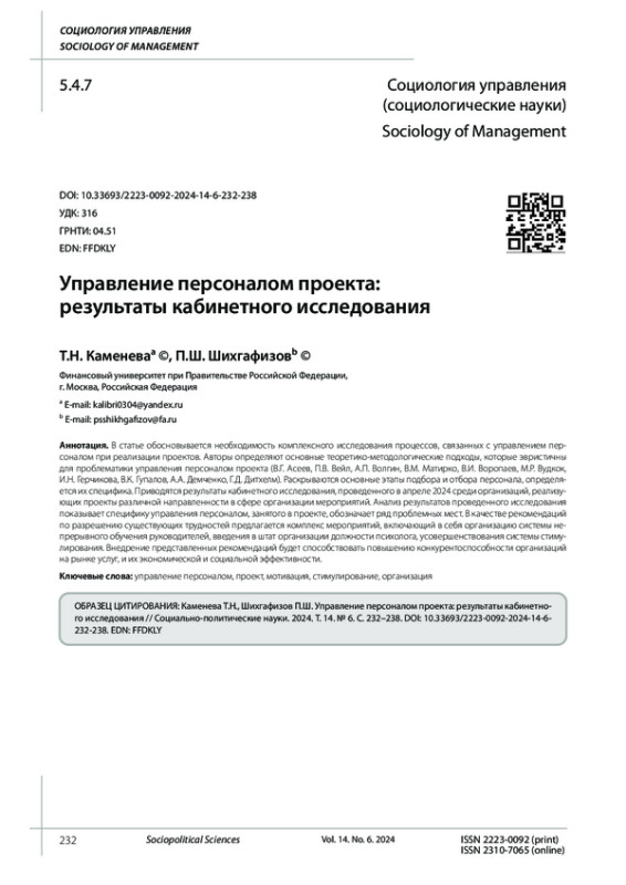 В статье обосновывается необходимость комплексного исследования процессов, связанных с управлением персоналом при реализации проектов. Авторы определяют основные теоретико-методологические подходы, которые эвристичны для проблематики управления персоналом проекта (В. Г. Асеев, П. В. Вейл, А. П. Волгин, В. М. Матирко, В. И. Воропаев, М. Р. Вудкок, И. Н. Герчикова, В. К. Гупалов, А. А. Демченко, Г. Д. Дитхелм). Раскрываются основные этапы подбора и отбора персонала, определяется их специфика. Приводятся результаты кабинетного исследования, проведенного в апреле 2024 среди организаций, реализующих проекты различной направленности в сфере организации мероприятий. Анализ результатов проведенного исследования показывает специфику управления персоналом, занятого в проекте, обозначает ряд проблемных мест. В качестве рекомендаций по разрешению существующих трудностей предлагается комплекс мероприятий, включающий в себя организацию системы непрерывного обучения руководителей, введения в штат организации должности психолога, усовершенствования системы стимулирования. Внедрение представленных рекомендаций будет способствовать повышению конкурентоспособности организаций на рынке услуг, и их экономической и социальной эффективности.