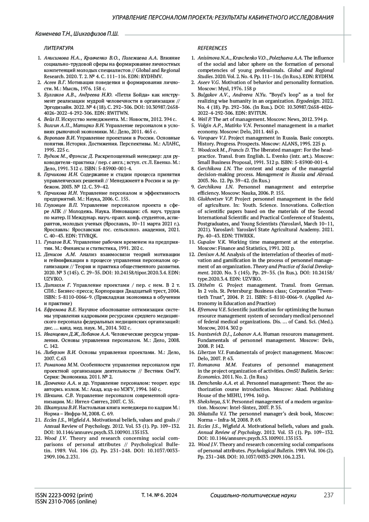 1. Анисимова Н.А., Кравченко В.О., Полежаева А.А. Влияние социально-трудовой сферы на формирование личностных компетенций молодых специалистов // Global and Regional Research. 2020. Т. 2. № 4. С. 111-116. EDN: RYDHMV