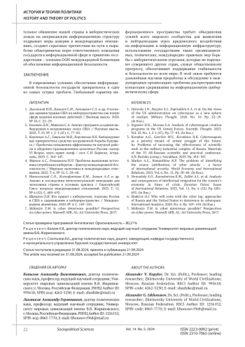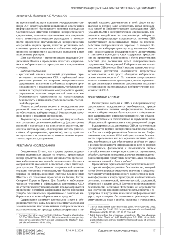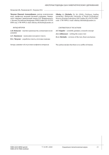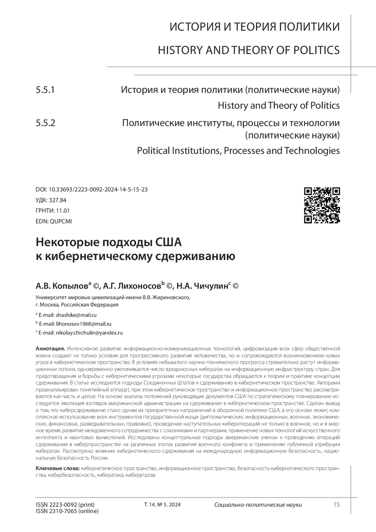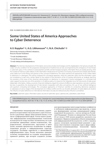 КОПЫЛОВ А. В., ЛИХОНОСОВ А. Г., ЧИЧУЛИН Н. А. НЕКОТОРЫЕ ПОДХОДЫ США К КИБЕРНЕТИЧЕСКОМУ СДЕРЖИВАНИЮ // СОЦИАЛЬНО-ПОЛИТИЧЕСКИЕ НАУКИ. 2024. Т. 14 № 5 (25 СТ.)