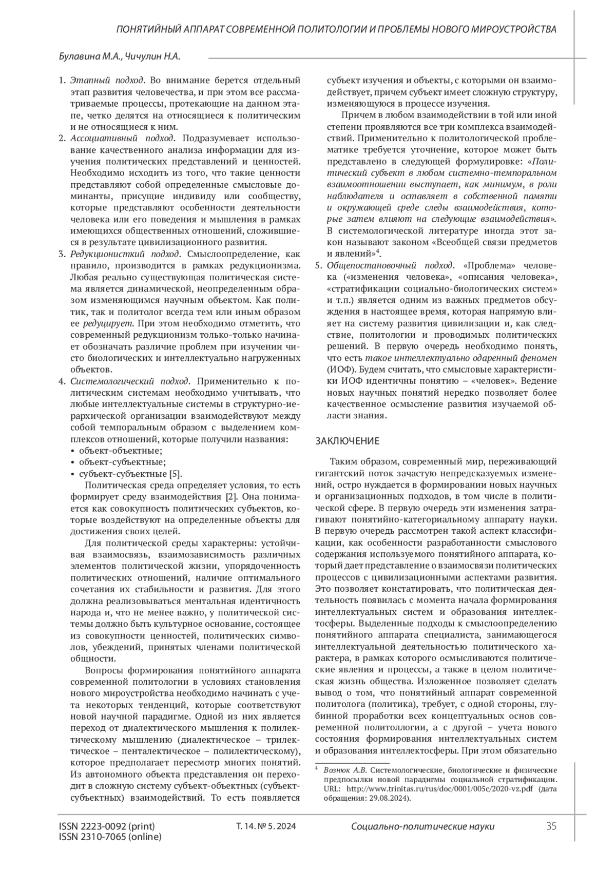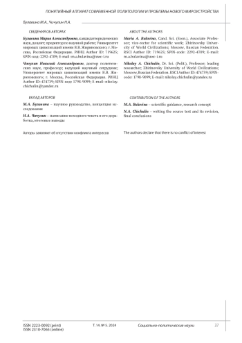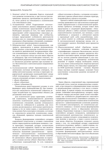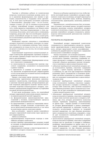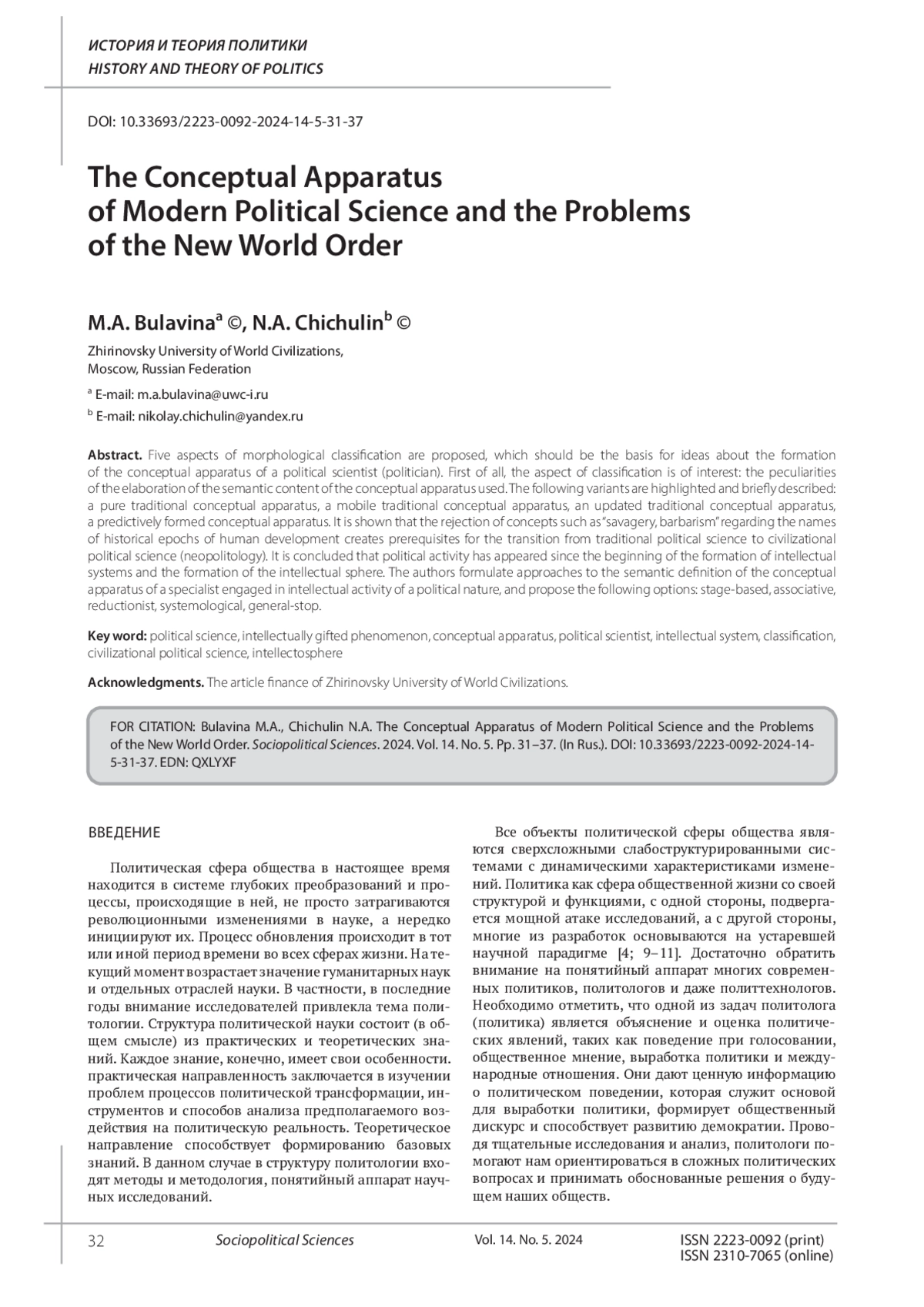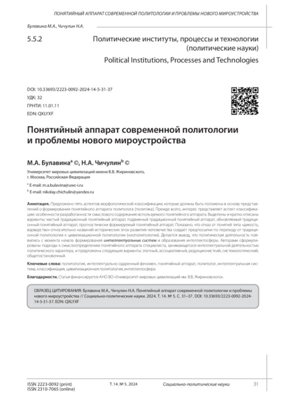 БУЛАВИНА М. А., ЧИЧУЛИН Н. А. ПОНЯТИЙНЫЙ АППАРАТ СОВРЕМЕННОЙ ПОЛИТОЛОГИИ И ПРОБЛЕМЫ НОВОГО МИРОУСТРОЙСТВА // СОЦИАЛЬНО-ПОЛИТИЧЕСКИЕ НАУКИ. 2024. Т. 14 № 5 (25 СТ.)