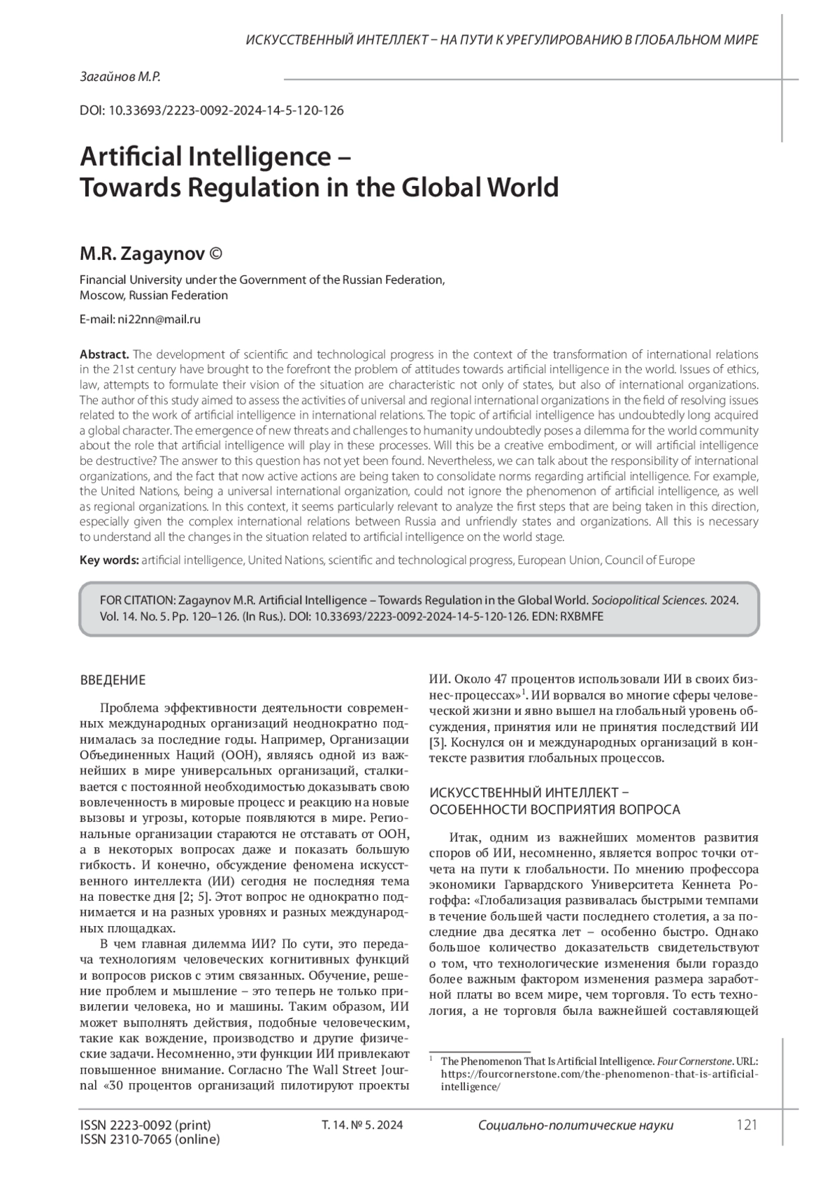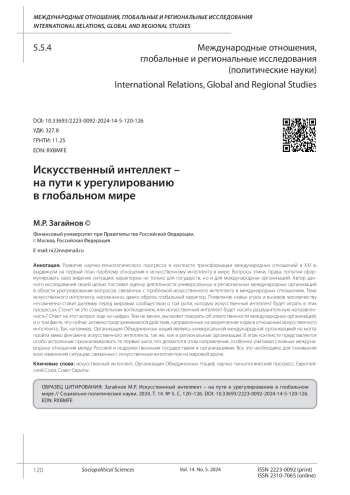 Развитие научно-технологического прогресса в контексте трансформации международных отношений в XXI в. выдвинули на первый план проблему отношения к искусственному интеллекту в мире. Вопросы этики, права, попытки сформулировать свое видение ситуации, характерны не только для государств, но и для международных организаций. Автор данного исследования своей целью поставил оценку деятельности универсальных и региональных международных организаций в области урегулирования вопросов, связанных с проблемой искусственного интеллекта в международных отношениях. Тема искусственного интеллекта, несомненно, давно обрела глобальный характер. Появление новых угроз и вызовов человечеству несомненно ставит дилемму перед мировым сообществом о той роли, которую искусственный интеллект будет играть в этих процессах. Станет ли это созидательным воплощением, или искусственный интеллект будет носить разрушительную направленность? Ответ на этот вопрос еще не найден. Тем не менее, мы может говорить об ответственности международных организаций, и о том факте, что сейчас активно предпринимаются действия, направленные на закрепление норм в отношении искусственного интеллекта. Так, например, Организация Объединенных наций являясь универсальной международной организацией не могла пройти мимо феномена искусственного интеллекта, так же, как и региональные организации. В этом контексте представляется особо актуальным проанализировать те первые шаги, что делаются в этом направлении, особенно учитывая сложные международные отношения между Россией и недружественными государствами и организациями. Все это необходимо для понимания всех изменения ситуации, связанных с искусственным интеллектом на мировой арене.