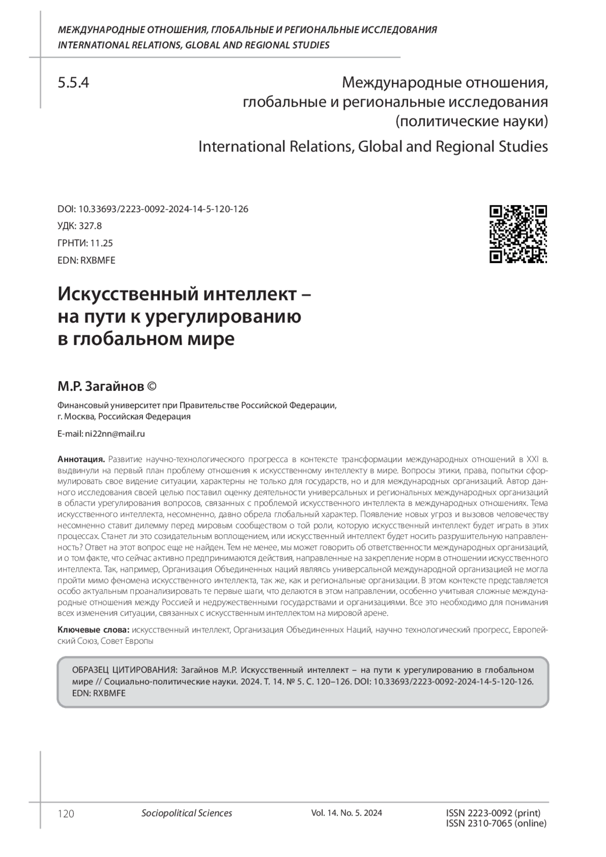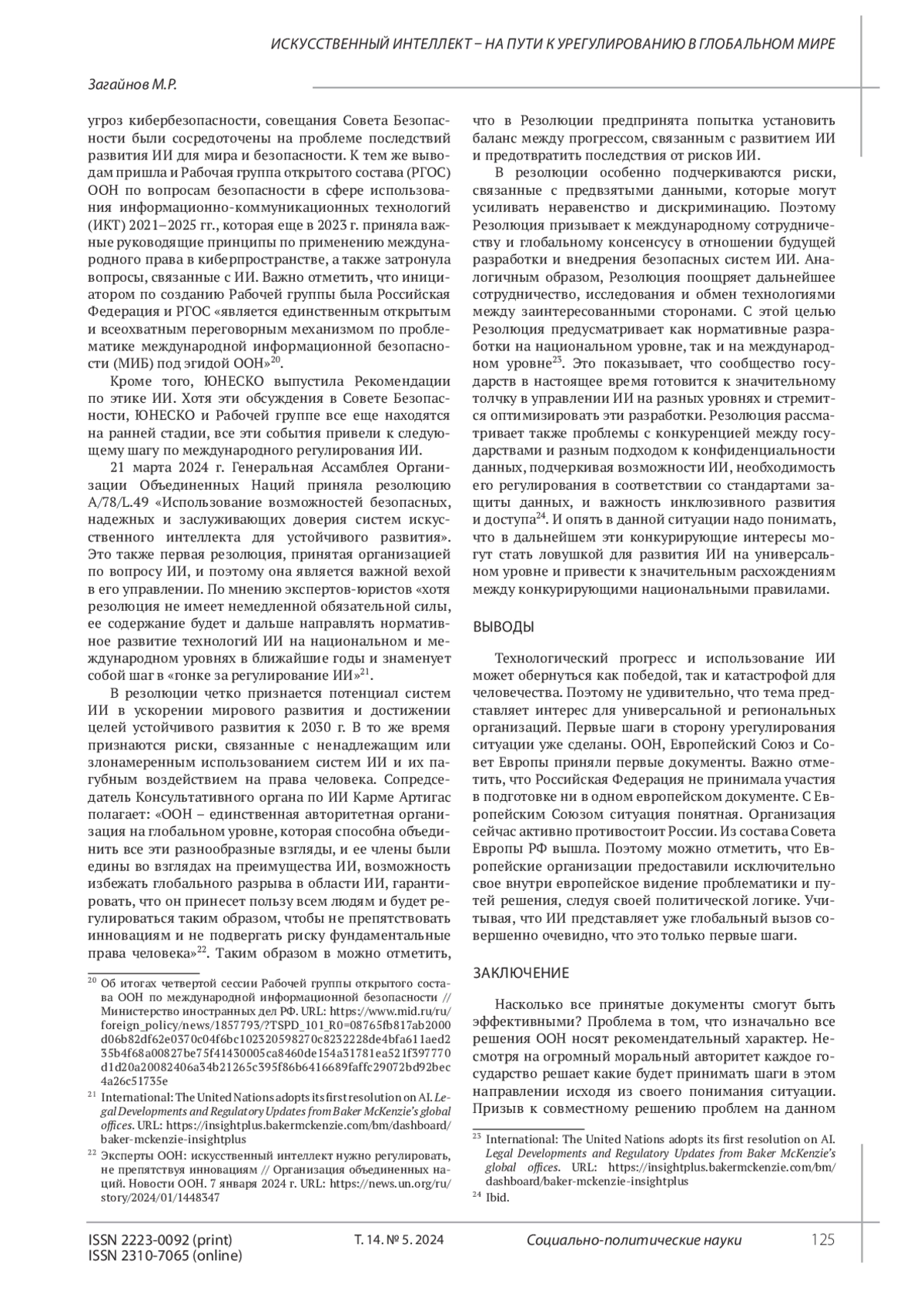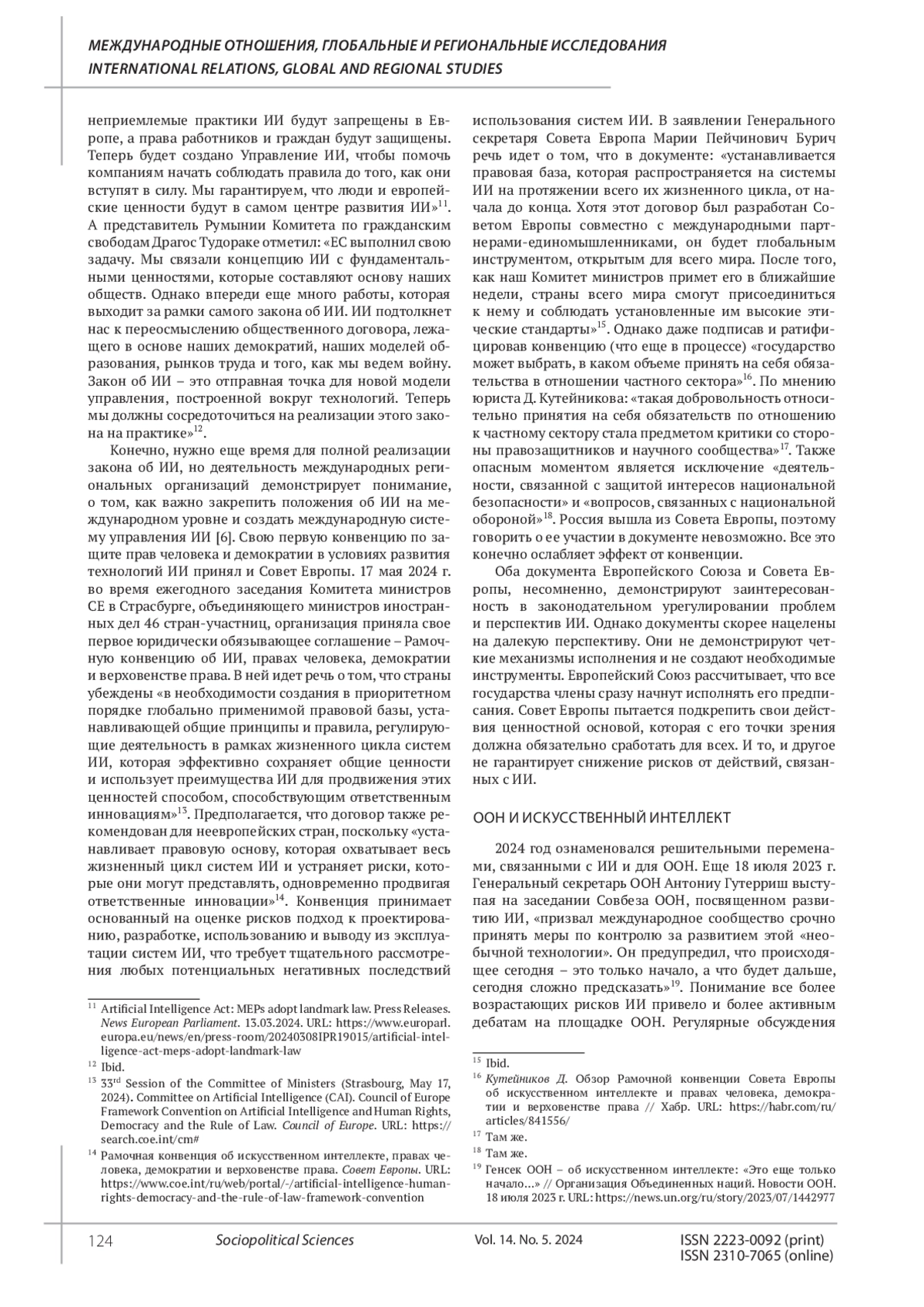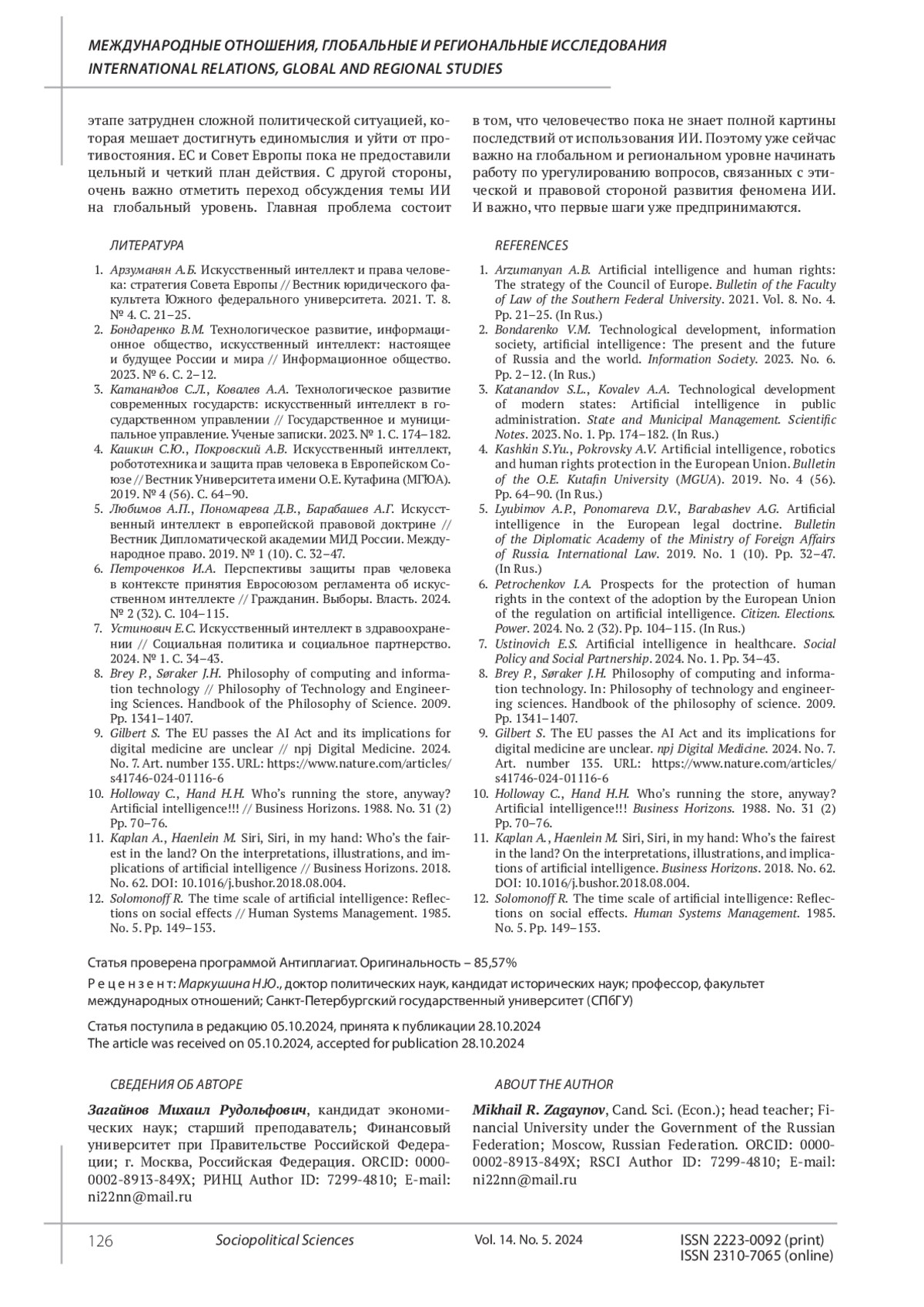 6. Петроченков И.А. Перспективы защиты прав человека в контексте принятия Евросоюзом регламента об искусственном интеллекте // Гражданин. Выборы. Власть. 2024. № 2 (32). С. 104-115. EDN: GDFAPN
