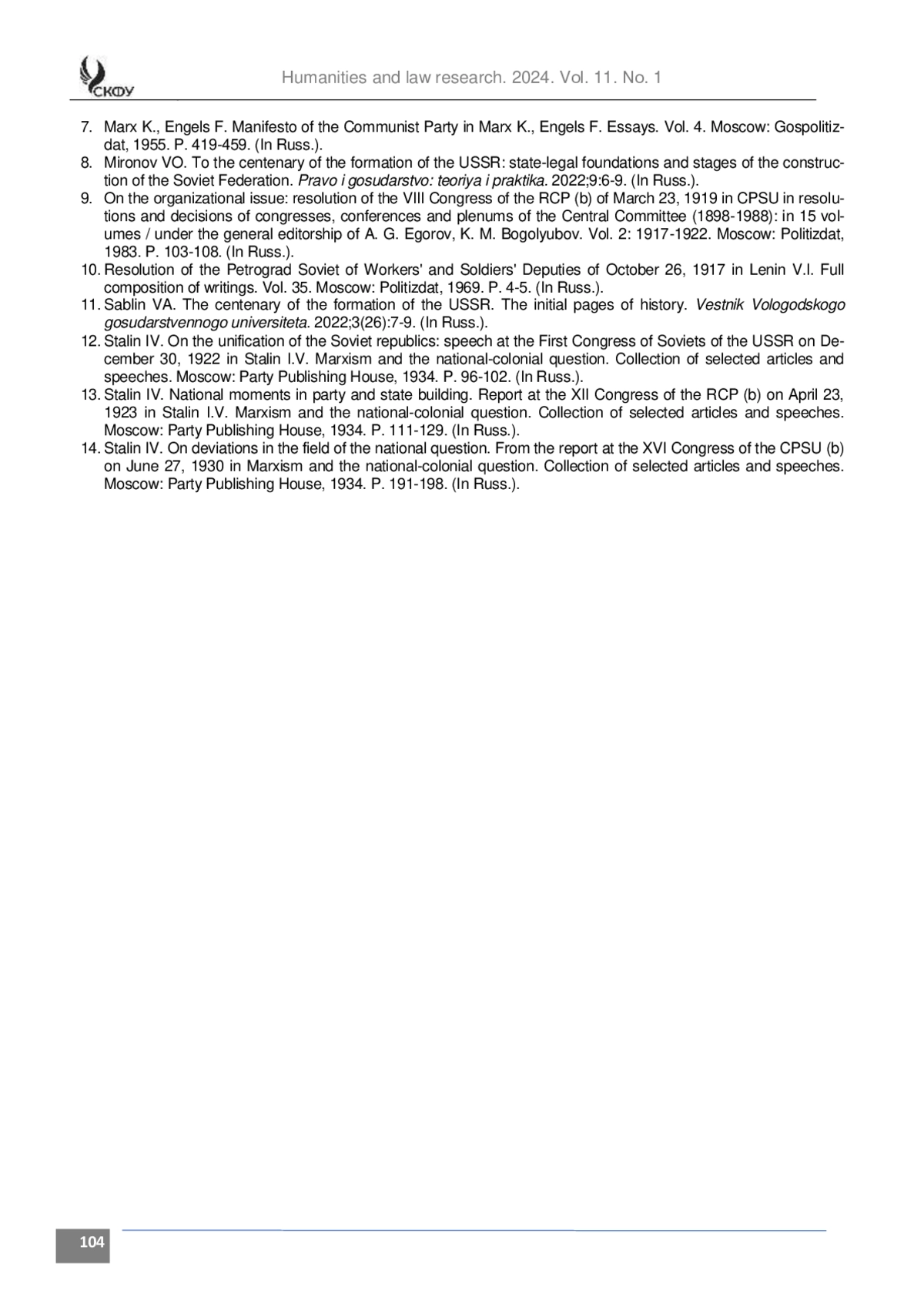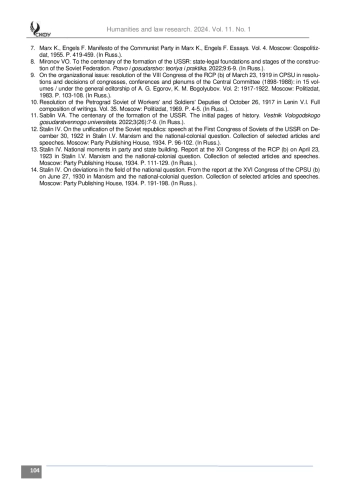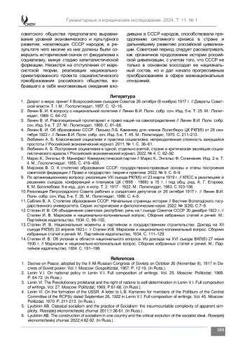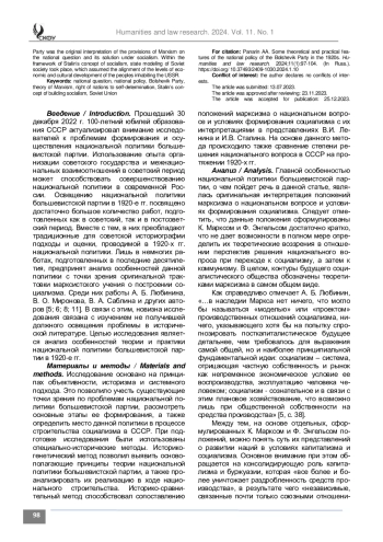 ПАНАРИН А. А. ОСОБЕННОСТИ ТЕОРИИ И ПРАКТИКИ НАЦИОНАЛЬНОЙ ПОЛИТИКИ БОЛЬШЕВИСТСКОЙ ПАРТИИ В 1920-Е ГГ. // ГУМАНИТАРНЫЕ И ЮРИДИЧЕСКИЕ ИССЛЕДОВАНИЯ. 2024. ТОМ 11, № 1
