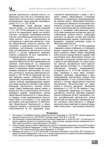 1. Костылева О. В. Заведомо ложное сообщение об акте терроризма (ст. 207 УК РФ) и угроза совершения террористического акта (ст. 205 УК РФ) // Уголовное право. 2018. № 2. С. 52-60.