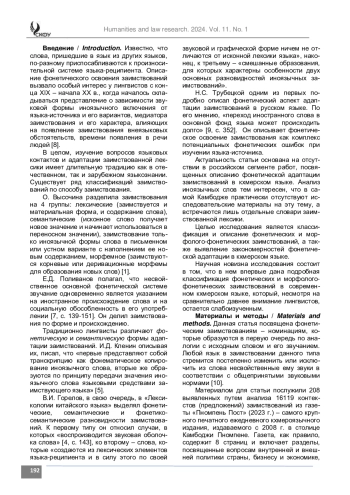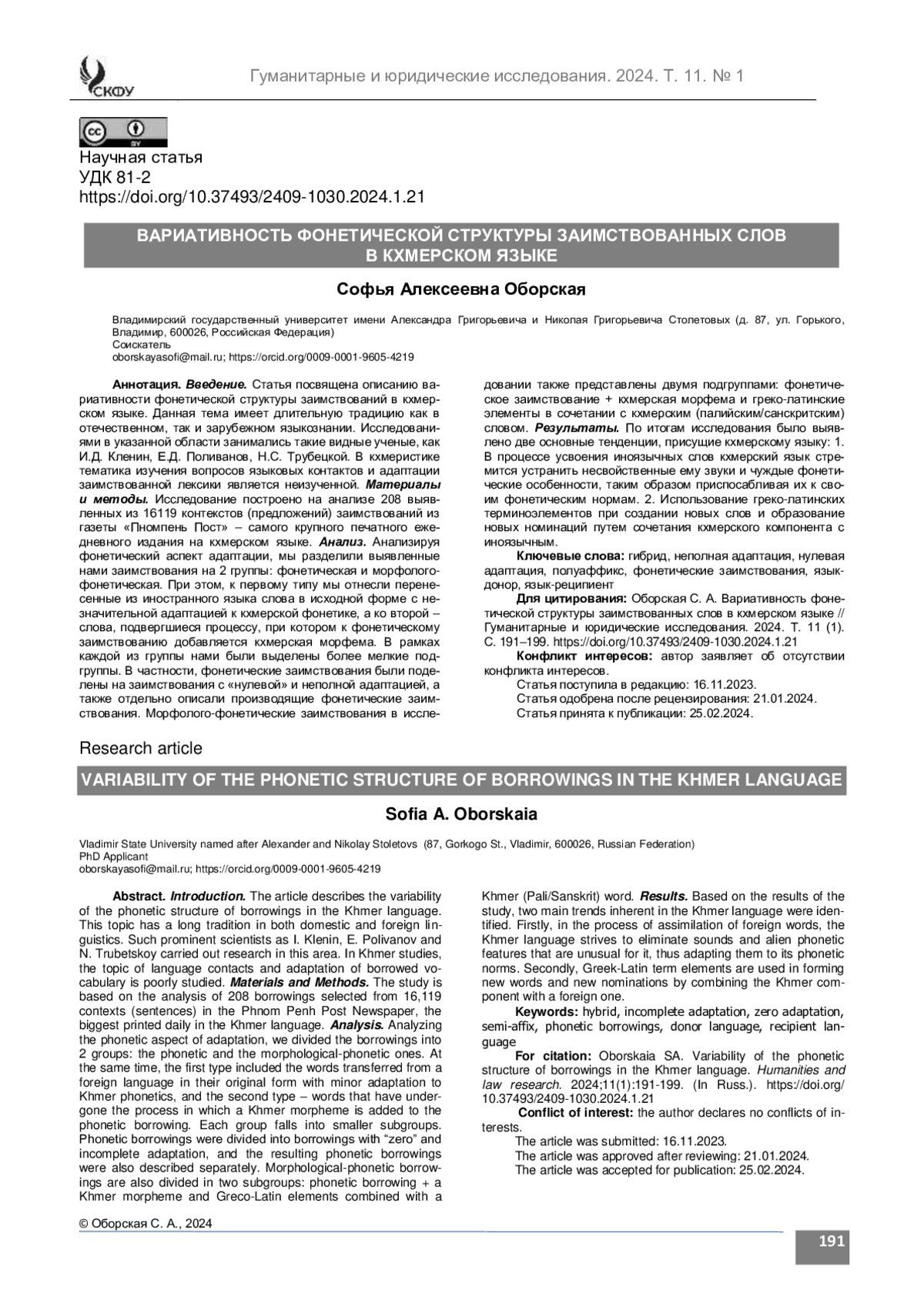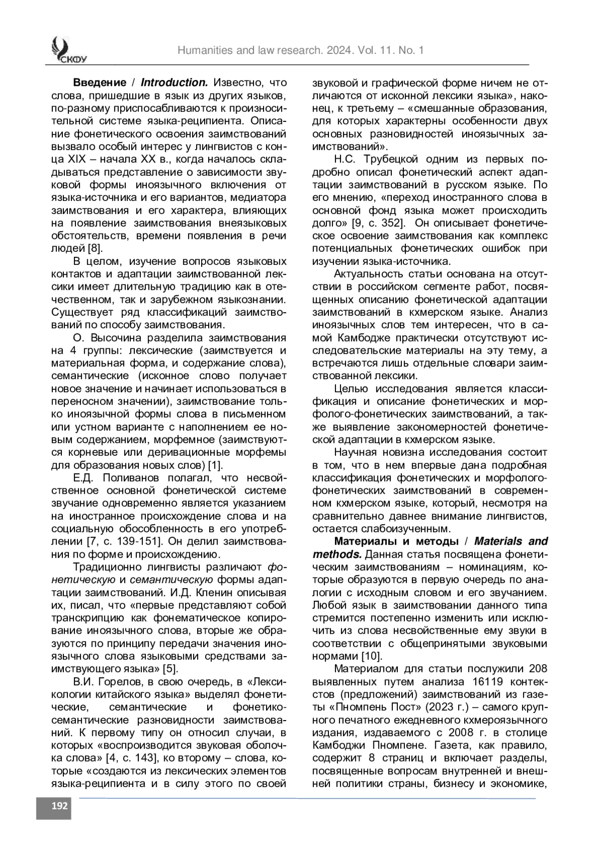 Введение. Статья посвящена описанию вариативности фонетической структуры заимствований в кхмерском языке. Данная тема имеет длительную традицию как в отечественном, так и зарубежном языкознании. Исследованиями в указанной области занимались такие видные ученые, как И. Д. Кленин, Е. Д. Поливанов, Н. С. Трубецкой. В кхмеристике тематика изучения вопросов языковых контактов и адаптации заимствованной лексики является неизученной.