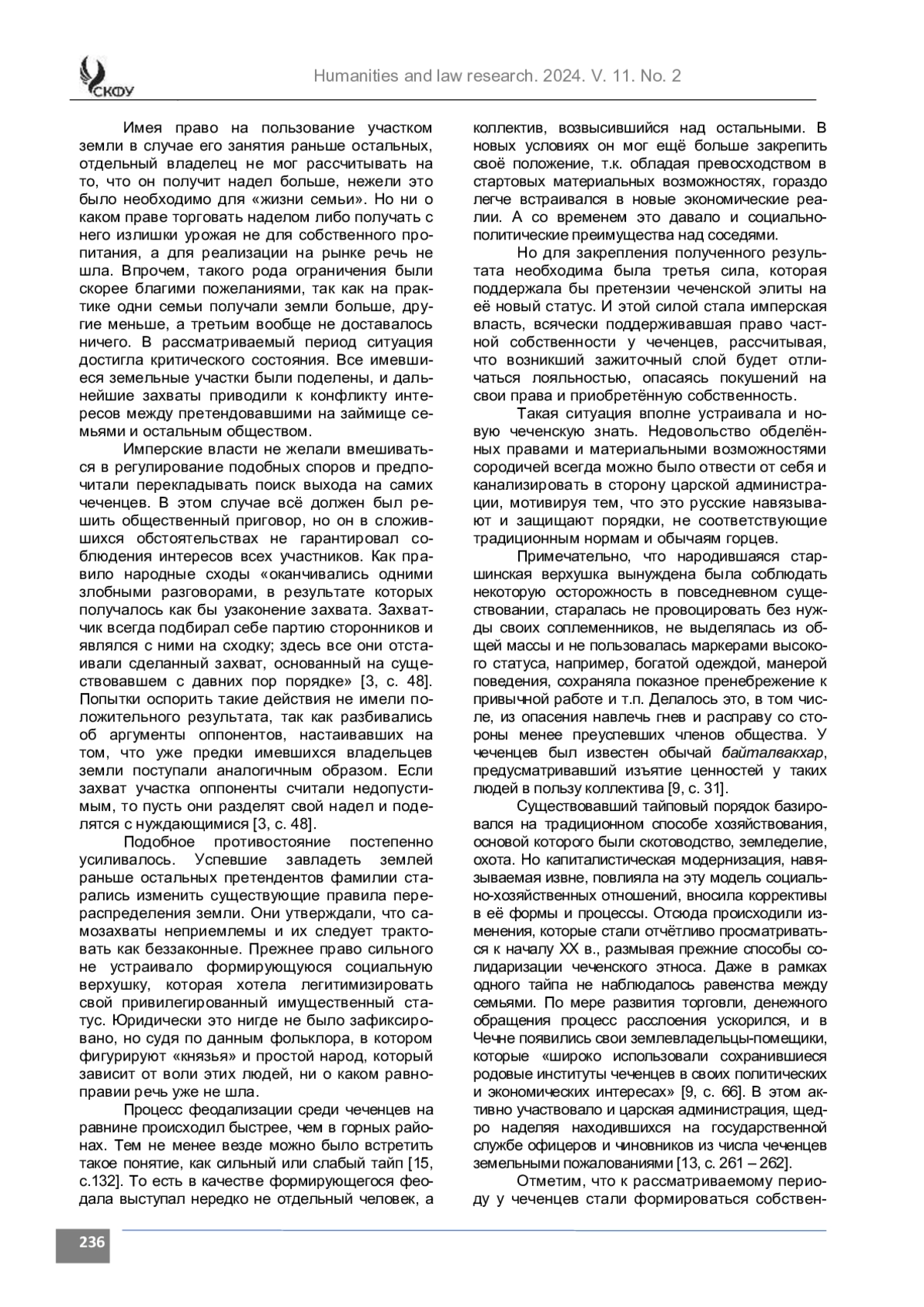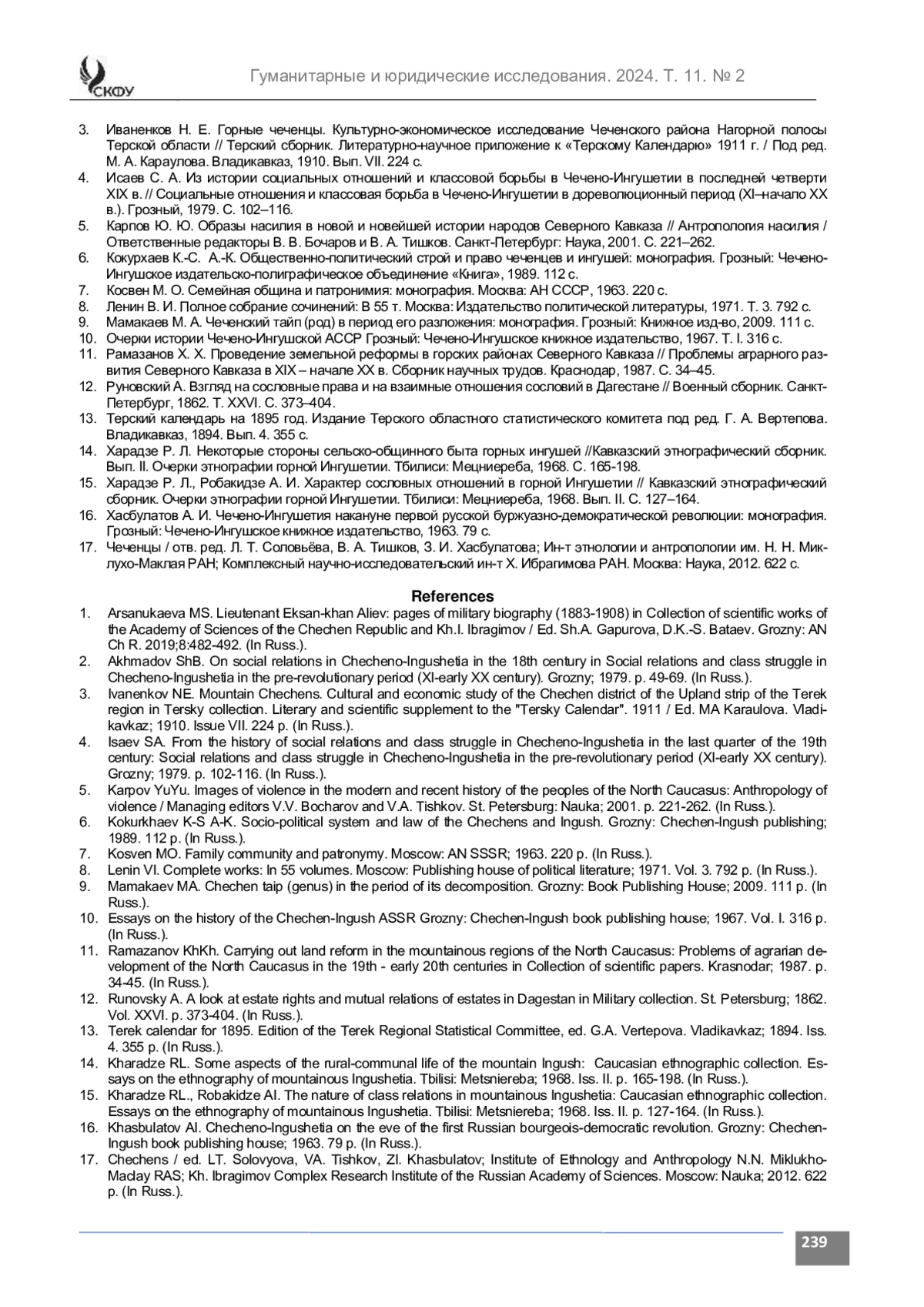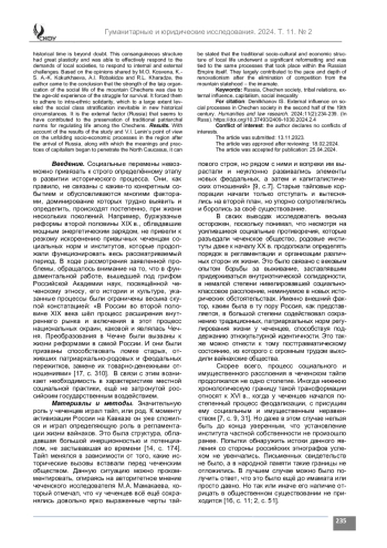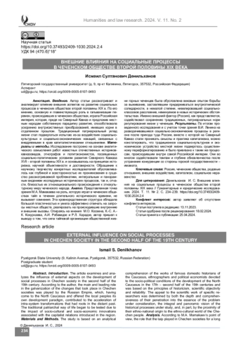 ДЕНИЛЬХАНОВ И. С. ВНЕШНИЕ ВЛИЯНИЯ НА СОЦИАЛЬНЫЕ ПРОЦЕССЫ В ЧЕЧЕНСКОМ ОБЩЕСТВЕ ВТОРОЙ ПОЛОВИНЫ XIX ВЕКА // ГУМАНИТАРНЫЕ И ЮРИДИЧЕСКИЕ ИССЛЕДОВАНИЯ. 2024. ТОМ 11, № 2