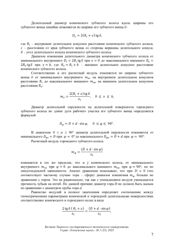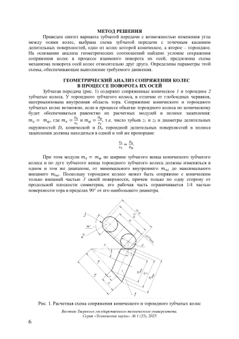 Одной из сторон научно-технического прогресса является ускоренное развитие робототехники, в том числе совершенствование и расширение возможностей приводов. В частности, проводятся научные изыскания в области приводов с изменяющимися углами между осями вращающихся валов. Высшие пары, к которым относятся зубчатые передачи, могут иметь линейное или точечное касание поверхностей звеньев. Линейное касание позволяет обеспечить более высокие прочностные свойства, точечное же дает большую степень свободы. Линейное касание реализовано в зубчатых передачах, делительные поверхности которых представляют собой линейчатые поверхности вращения: в виде прямых круговых цилиндра и конуса, в том числе их предельных вариантов – реечного зацепления и вращения с участием плоского диска, а также однополостного гиперболоида вращения [1]. Точечное касание возможно с участием в качестве делительной поверхности вращения, образованной вращением кривых линий. Представляет интерес рассмотрение поверхностей второго порядка, к которым относятся тор [2] и его частные случаи: сфера [3], эллипсоид, параболоид и двуполостной гиперболоид; они могут соприкасаться в одной точке, вокруг которой возможен взаимный поворот осей таких колес. Рассматривается устройство и обосновываются параметры зубчатой передачи, одно из колес которой коническое, а второе – тороидное и сопряжение колес сохраняется в процессе взаимного поворота их осей