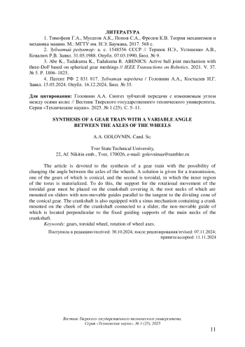 Статья посвящена синтезу зубчатой передачи с возможностью изменения угла между осями колес. Приведено решение для передачи, одно из зубчатых колес которой коническое, а второе – тороидное с материализованной внутренней областью тора. Для этого опора для вращательного движения тороидного зубчатого колеса должна быть размещена на охватывающем его коленчатом валу, коренные шейки которого смонтированы на ползунах с неподвижными направляющими, параллельными касательной к делительному конусу конического зубчатого колеса. Коленчатый вал снабжен синусным механизмом, содержащим смонтированный на щеке коленчатого вала кривошип, соединенный с ползуном, неподвижная направляющая которого расположена перпендикулярно неподвижным направляющим опор коренных шеек коленчатого вала