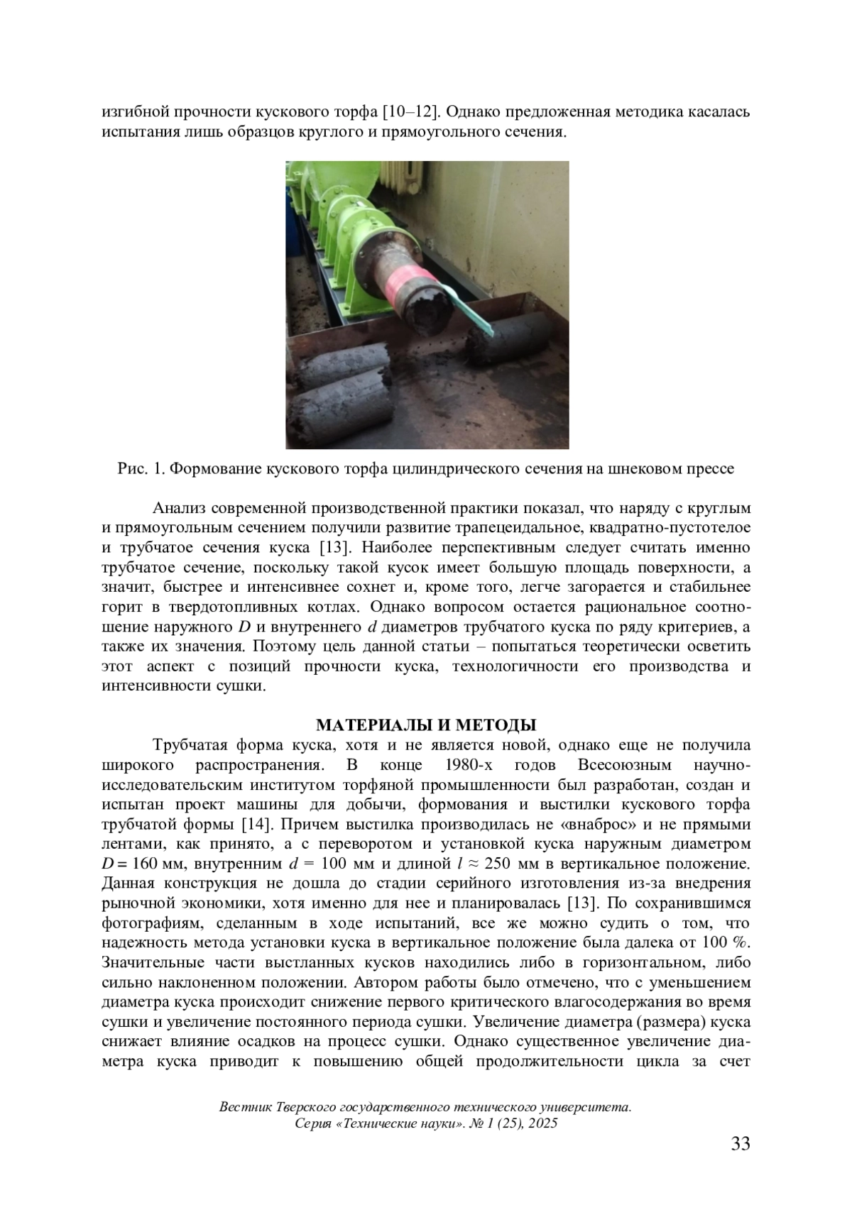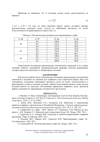 Трубчатая форма кускового торфа по праву считается наиболее перспективной, поскольку обладает большей площадью испарения влаги, лучше поджигается и стабильнее горит в твердотопливных котлах. Такой кусок характеризуется такими параметрами, как наружный диаметр, внутренний диаметр, длина. Естественно, что возникают вопросы о параметрах, которые можно назвать рациональными, или оптимальными по критериям прочности на изгиб, технологичности и равномерности сушки. В данной статье сделана попытка ответить на поставленные вопросы теоретически. Приведены рекомендуемые рациональные соотношения диаметров и сами диаметры торфяных кусков. Отмечено, что предполагается необходимая экспериментальная проверка полученных результатов в лабораторных условиях