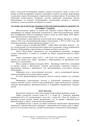 На основе данных эксплуатации буровых станков СБШ-250 в период с 2013 по 2023 годы на карьере Кальмакыр установлена частота отказов для станков и их основных систем: мачты, ходовой тележки, редуктора, компрессора, гидросистемы. Показано, что количество отказов изменяется циклично в процессе эксплуатации станков, при этом их число для узлов незначительно варьируется у различных станков. Большее количество возникает в различные периоды от начала эксплуатации узлов, а максимальное приходится на компрессор и гидросистему. Учет цикличности отказов может быть использован при прогнозе производительности и расчете необходимого количества запасных частей