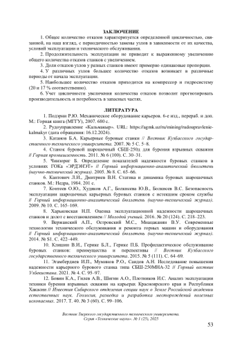 7. Контеев О.Ю., Худяков А.Г., Болкисева Ю.В., Болкисев В.С. Безопасность эксплуатации шарошечных карьерных буровых станков с истекшим сроком службы // Горный информационно-аналитический бюллетень (научно-технический журнал). 2009. № 10. С. 165-169.