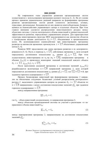 На современном этапе управление развитием организационных систем осуществляется с использованием программно-целевого подхода [1, 2]. На его основе процесс принятия управленческих решений направлен на формирование программы развития организационных систем разной сложности: автономных, сетевых, отраслевых, региональных. Большинство из них являются многообъектными, базирующимися на взаимодействии управляющего центра и отдельных объектов. При этом главное внимание уделяется распределению инвестиционного ресурса между объектами системы с учетом интегрального объема инвестиций и уровня показателей эффективности развития, определяемых управляющим центром. Для характеристики структуры инвестирования структура МОС рассматривается как множество объектов с однородными видами деятельности